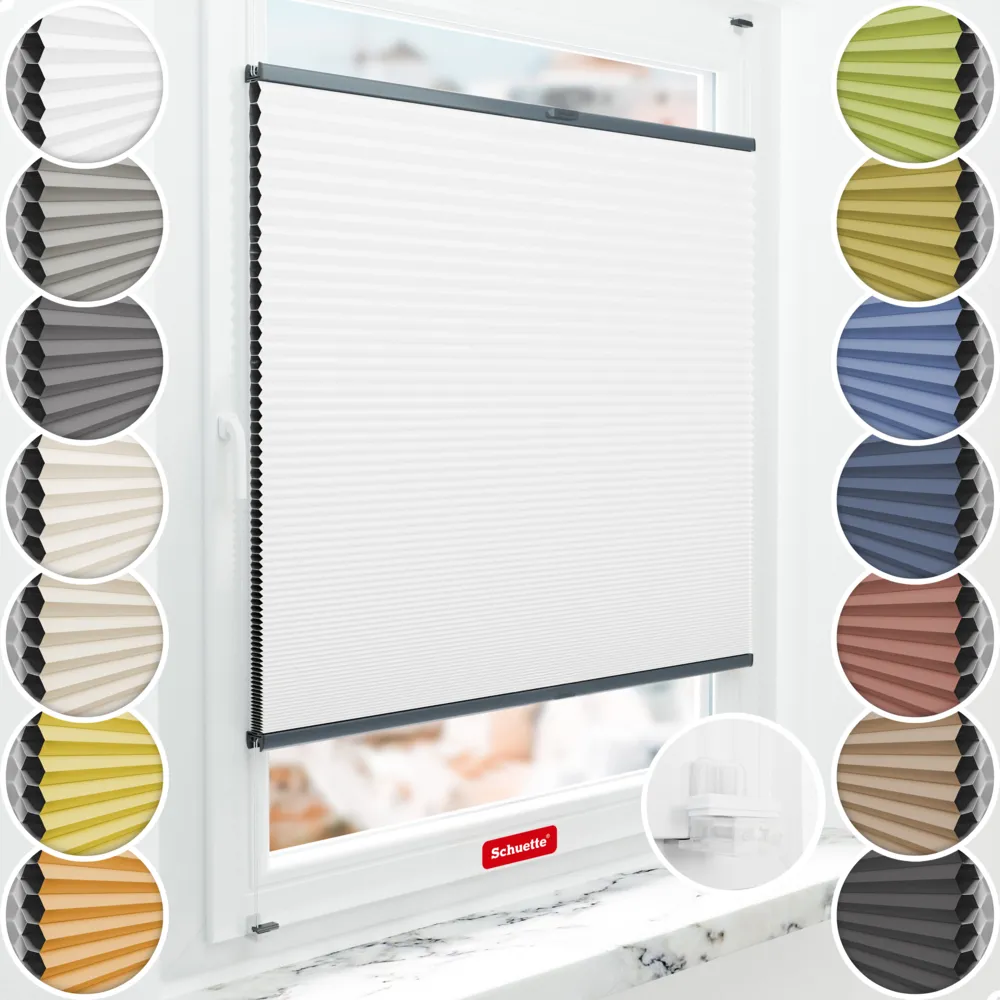 Schuette® Honeycomb Blackout Pleated Blind Made to Measure without Drilling • Blackout x Honey Collection: Moonlight (White) • Suprafix Clamp Holder "Incognito X" • Profile: Anthracite