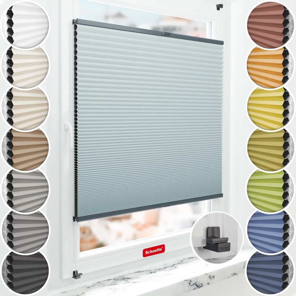 Schuette® Honeycomb Blackout Pleated Blind Made to Measure without Drilling • Blackout x Honey Collection: Cloud Nine (Pastel blue) • Suprafix Clamp Holder “X” • Profile: Anthracite