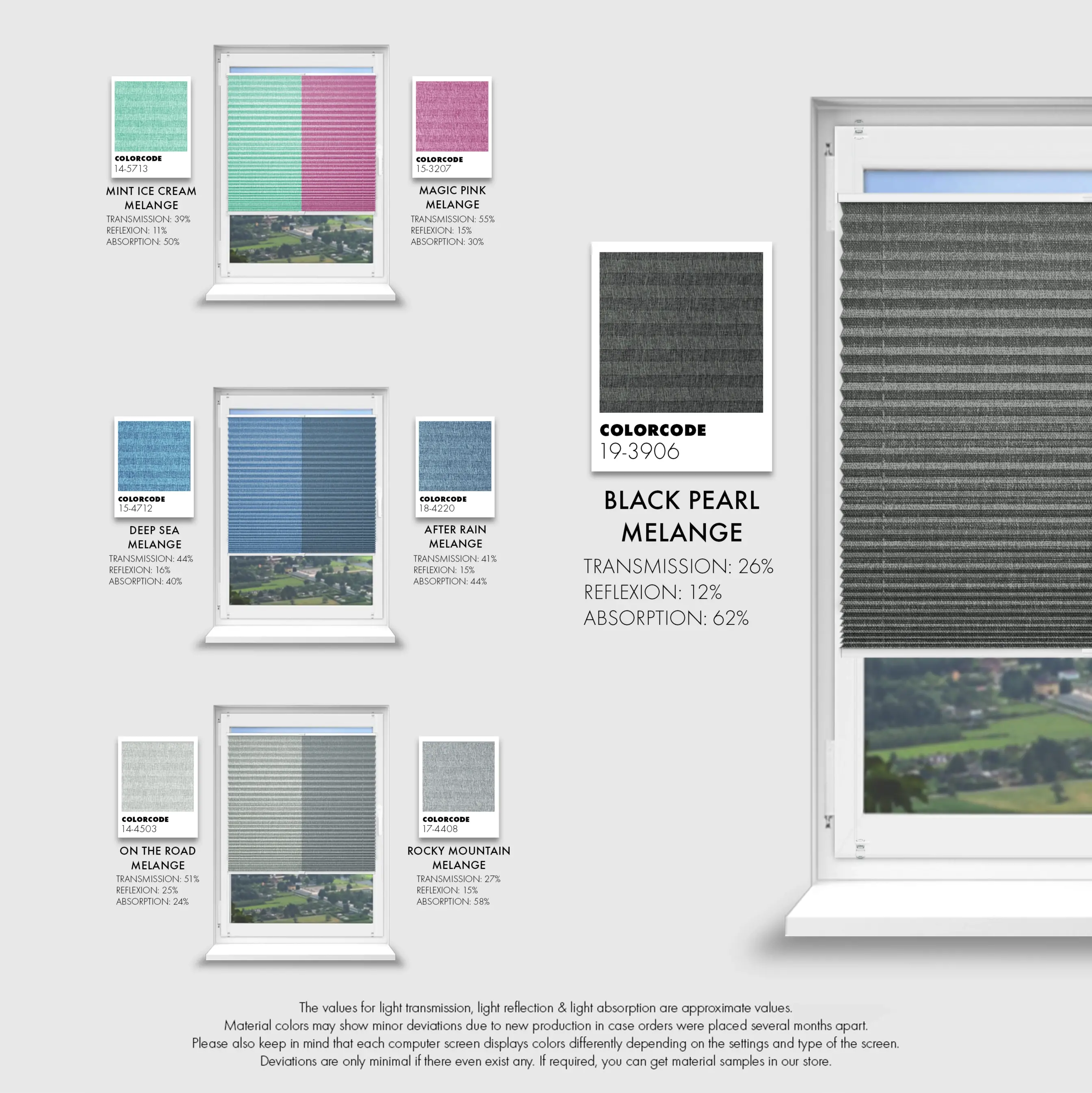 - Pleated blind fabric: 100% opaque, medium light transmission, slightly darkening, vibrant colors, UV protection (no rapid fading), Oekotex certified, carefully dyed & self-developed colors
