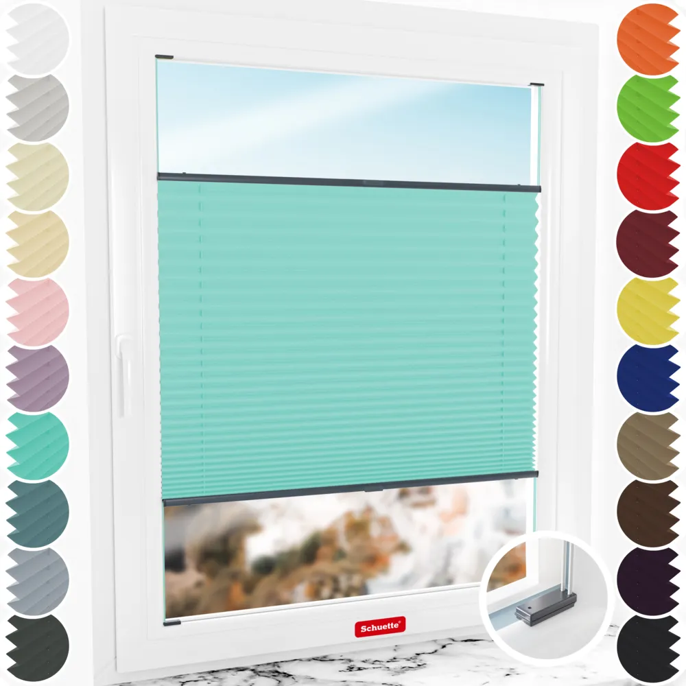 Schuette® Pleated Blind Made to Measure with Drilling • Thermo Collection: Tide Tune (Turkis) • Suprafix Mounts “For screwing” • Profile Color: Anthracite