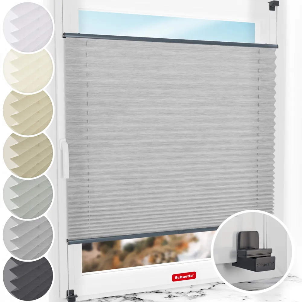 - Features Schuette® pleated blinds without drilling: Infinitely adjustable (Up&Down), double tensioned (NO swinging), special aluminum profiles (NO! bending/breaking), fully assembled as far as possible (NO! threading the pleated cord / NO! tedious assembly of many individual parts)