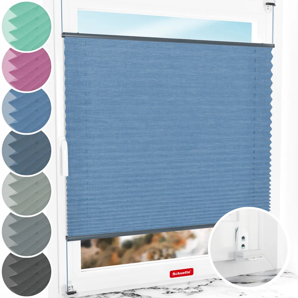 - Features Schuette® pleated blinds without drilling: Infinitely adjustable (Up&Down), double tensioned (NO swinging), special aluminum profiles (NO! bending/breaking), fully assembled as far as possible (NO! threading the pleated cord / NO! tedious assembly of many individual parts)