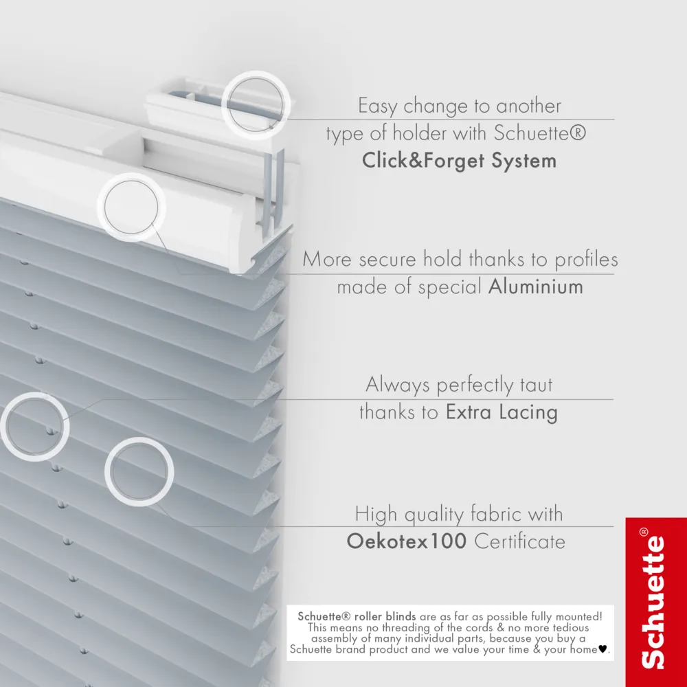 - Features Schuette® pleated blinds without drilling: Infinitely adjustable (Up&Down), double tensioned (NO swinging), special aluminum profiles (NO! bending/breaking), fully assembled as far as possible (NO! threading the pleated cord / NO! tedious assembly of many individual parts)