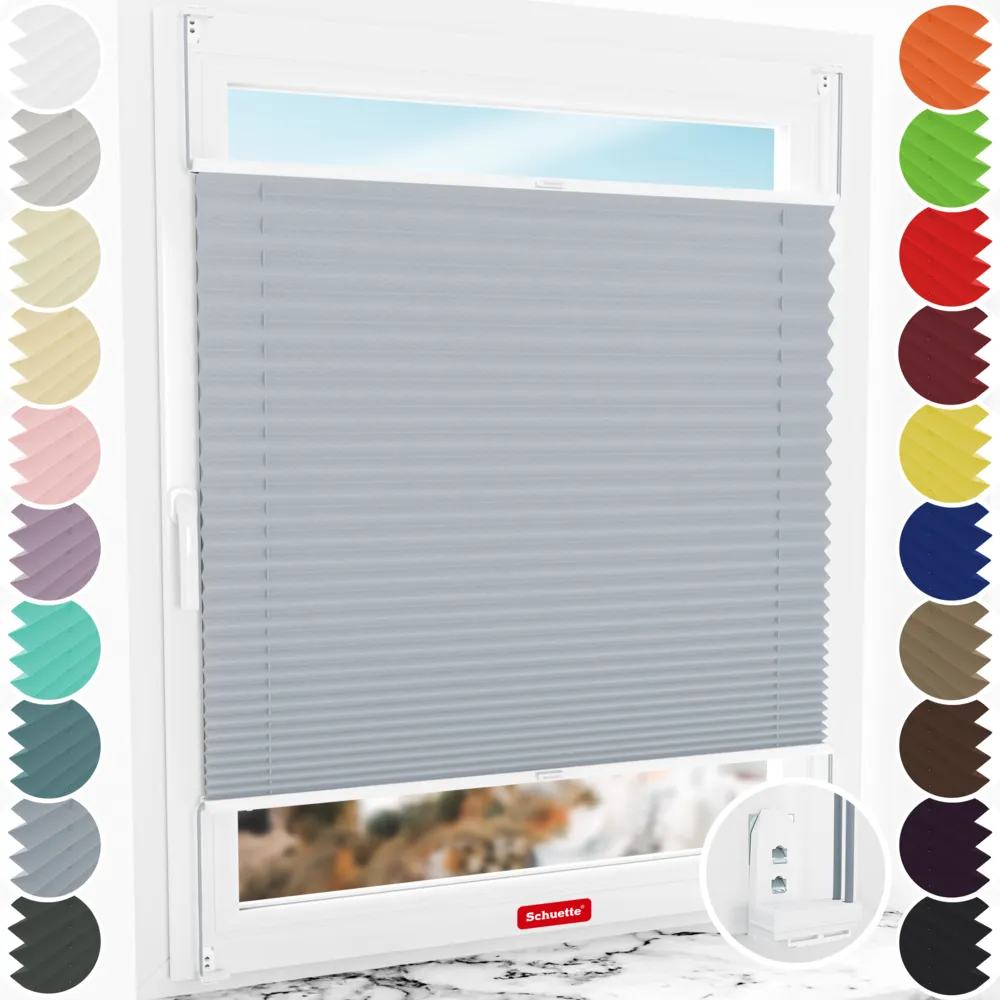 - Features Schuette® pleated blinds without drilling: Infinitely adjustable (Up&Down), double tensioned (NO swinging), special aluminum profiles (NO! bending/breaking), fully assembled as far as possible (NO! threading the pleated cord / NO! tedious assembly of many individual parts)