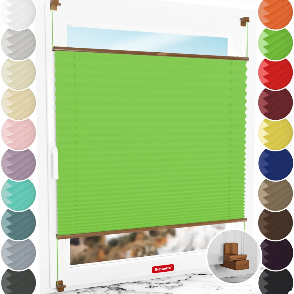 Schuette® Pleated Blind Made to Measure without Drilling • Thermo Collection: Leaf Joy (Green) • Suprafix Clamp holder “X” • Profile Color: Oak