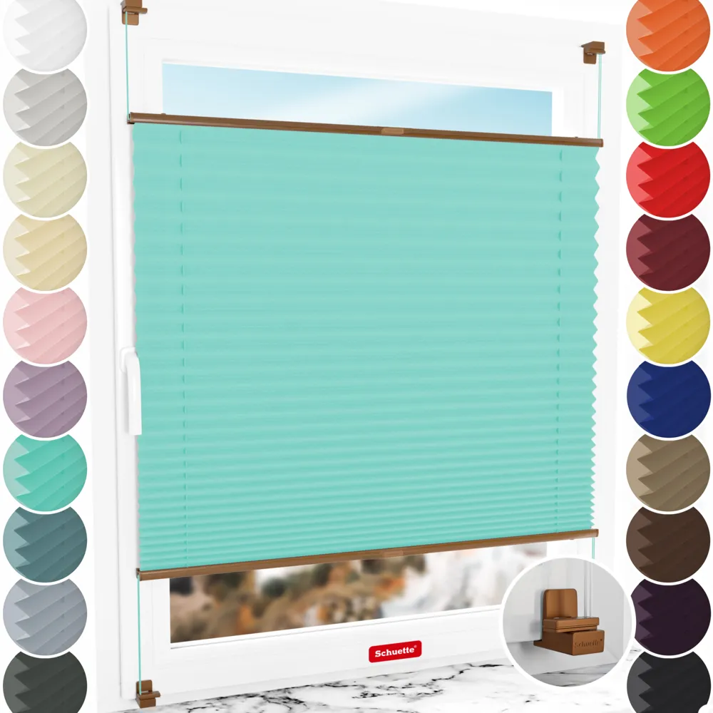 Schuette® Pleated Blind Made to Measure without Drilling • Thermo Collection: Tide Tune (Turkis) • Suprafix Clamp holder “X” • Profile Color: Oak