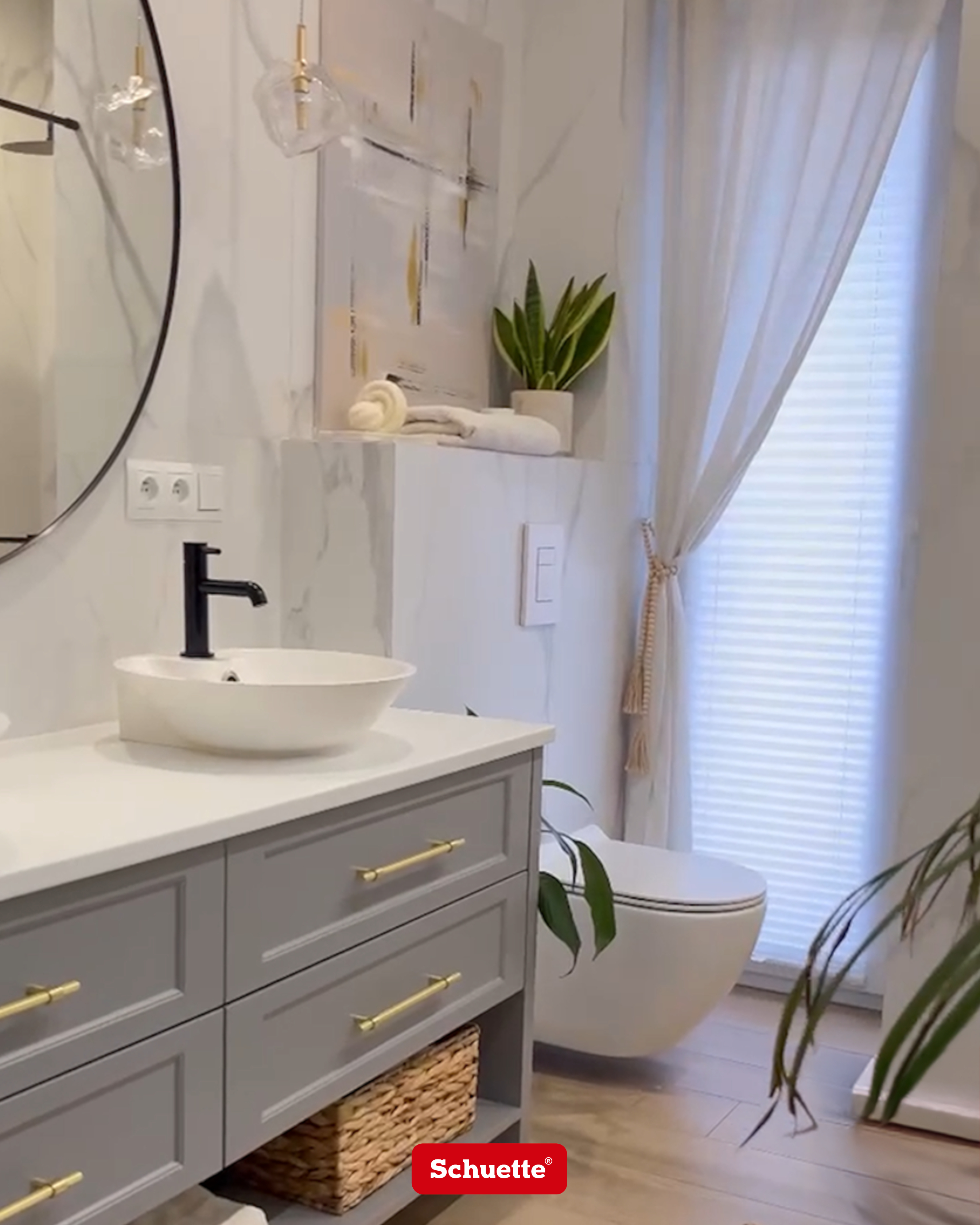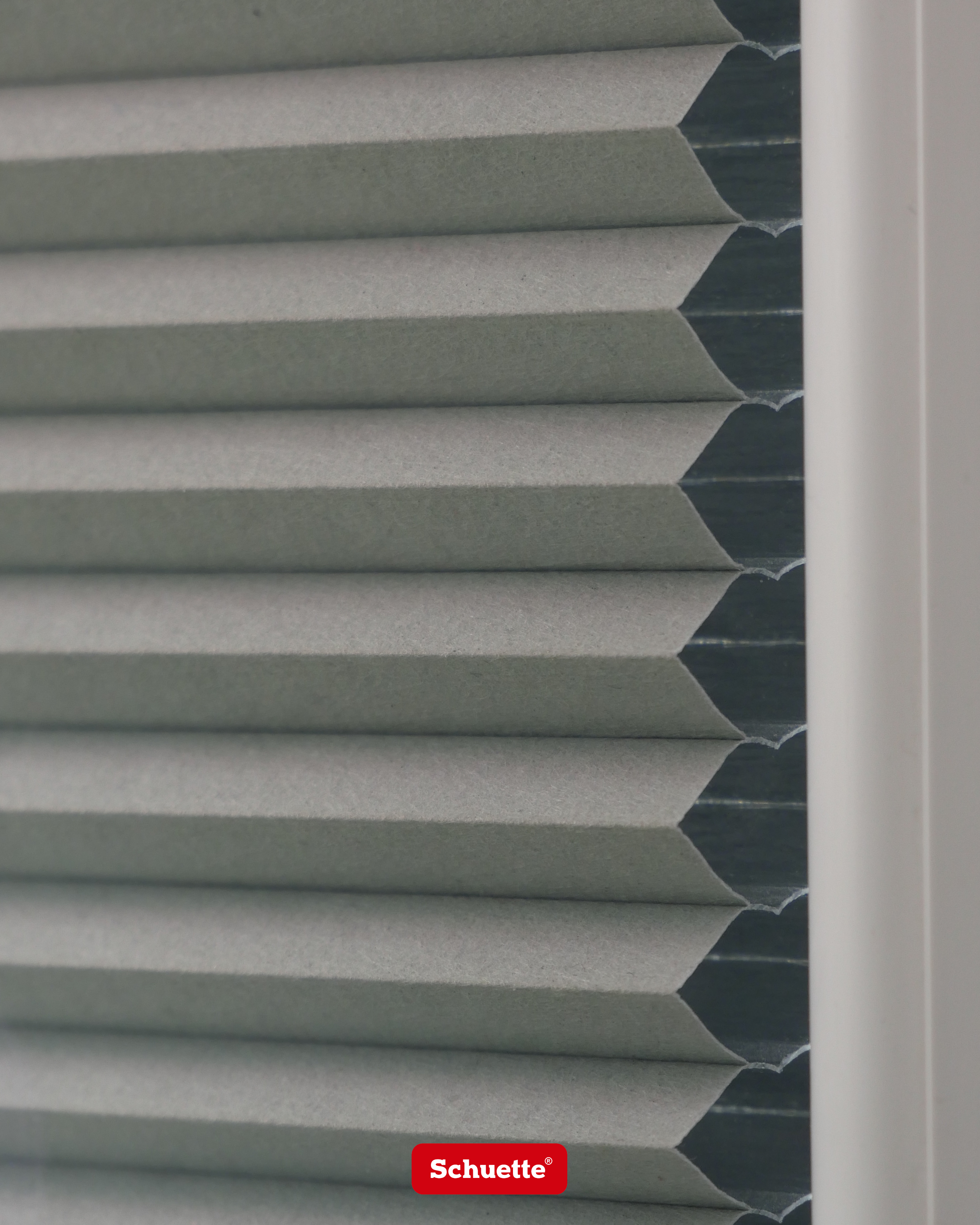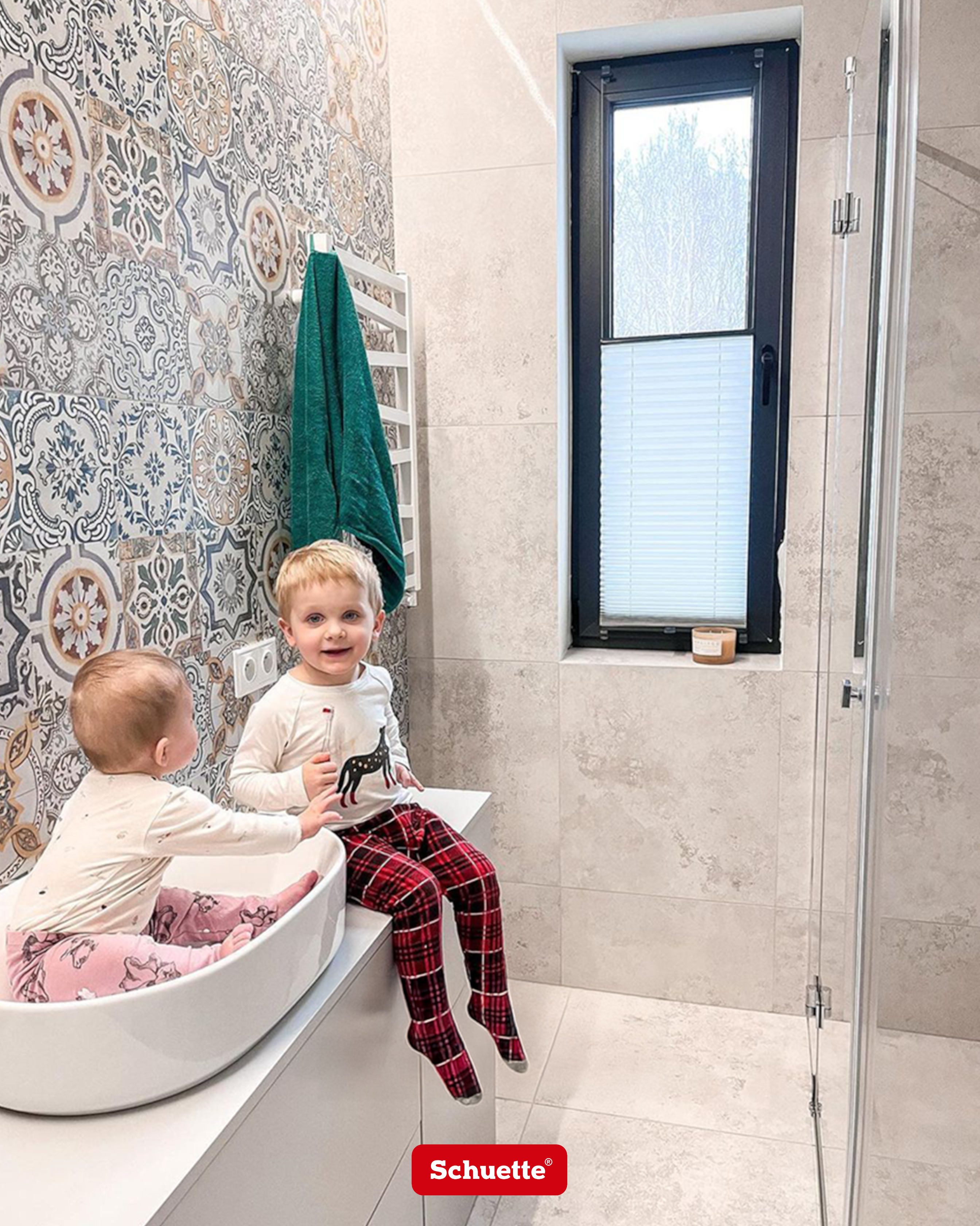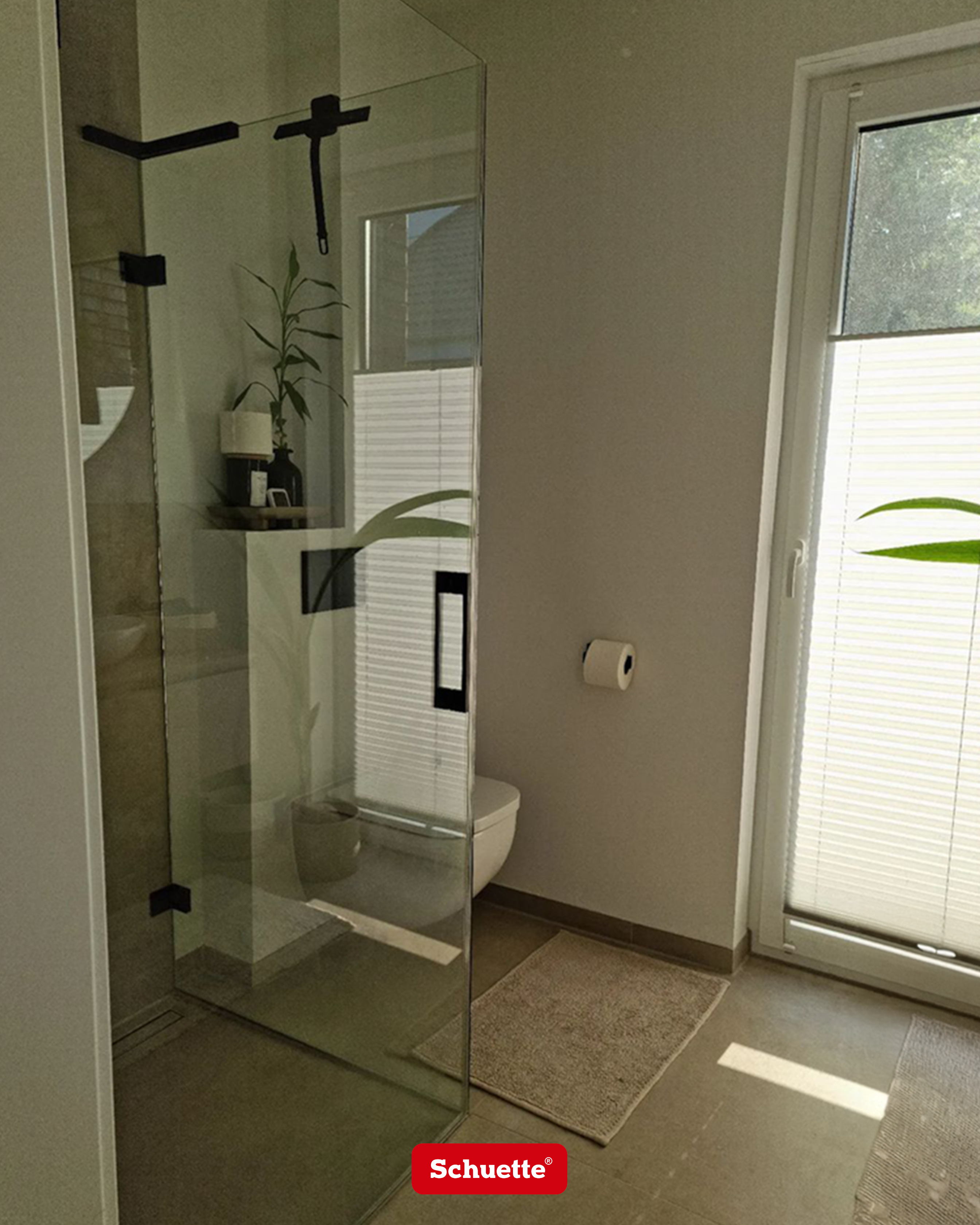 La mejor opción = Estores plisados Thermo x Honey: esta colección de estores translúcidos con mejor aislamiento. De este modo, se obtiene una bella luz natural, a la vez que se conserva la privacidad y una temperatura adecuada en el baño.