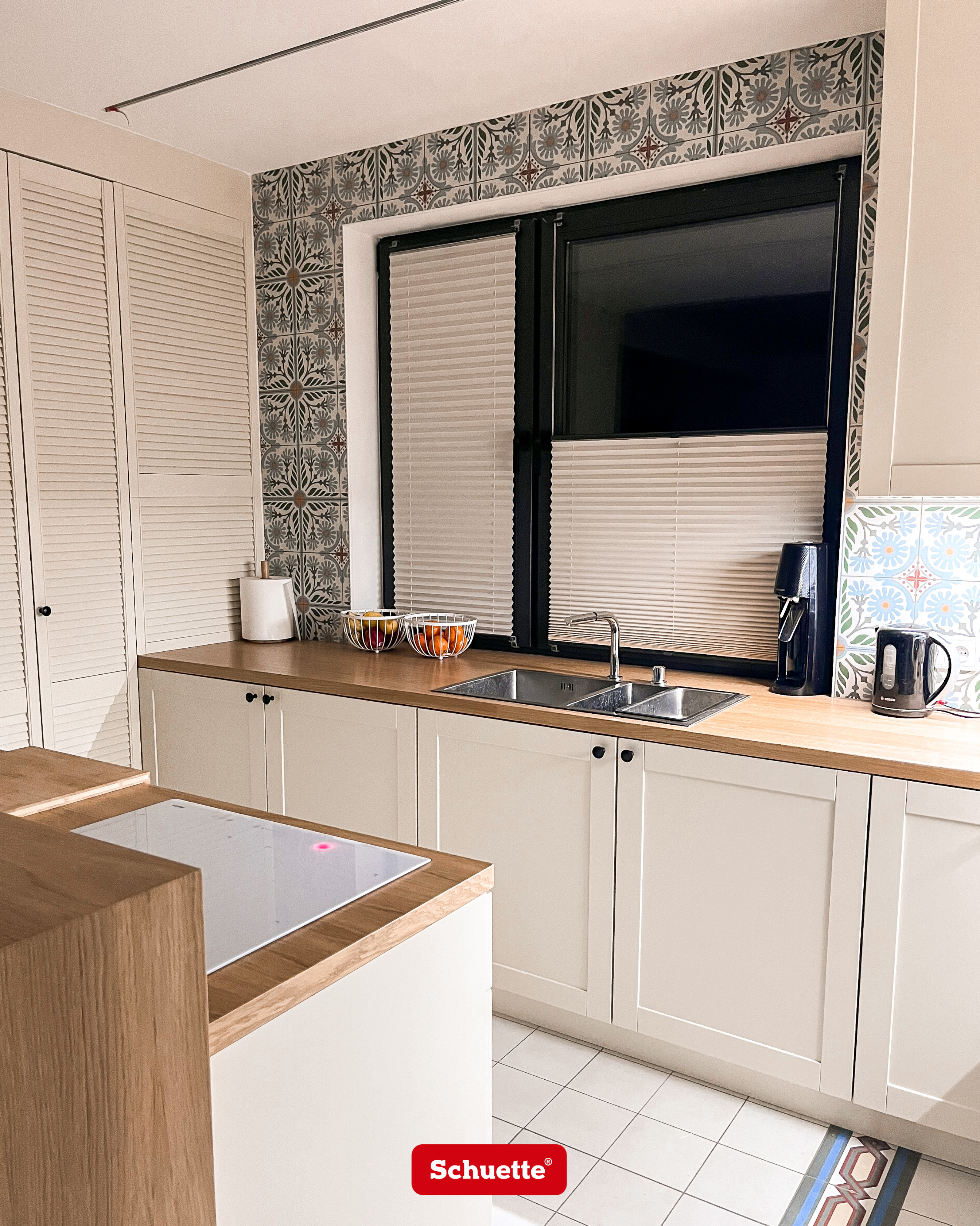 - Tipo de tejidos disponibles: estas cortinas están disponibles en versión plisada o como cortinas enrollables para cocina. Ambos tipos de estores, aparte de con tejidos opacos, pueden encontrarse con tejidos semitransparentes, lo cual puede ser útil en la cocina, donde se requiere la luz del sol y privacidad por igual.