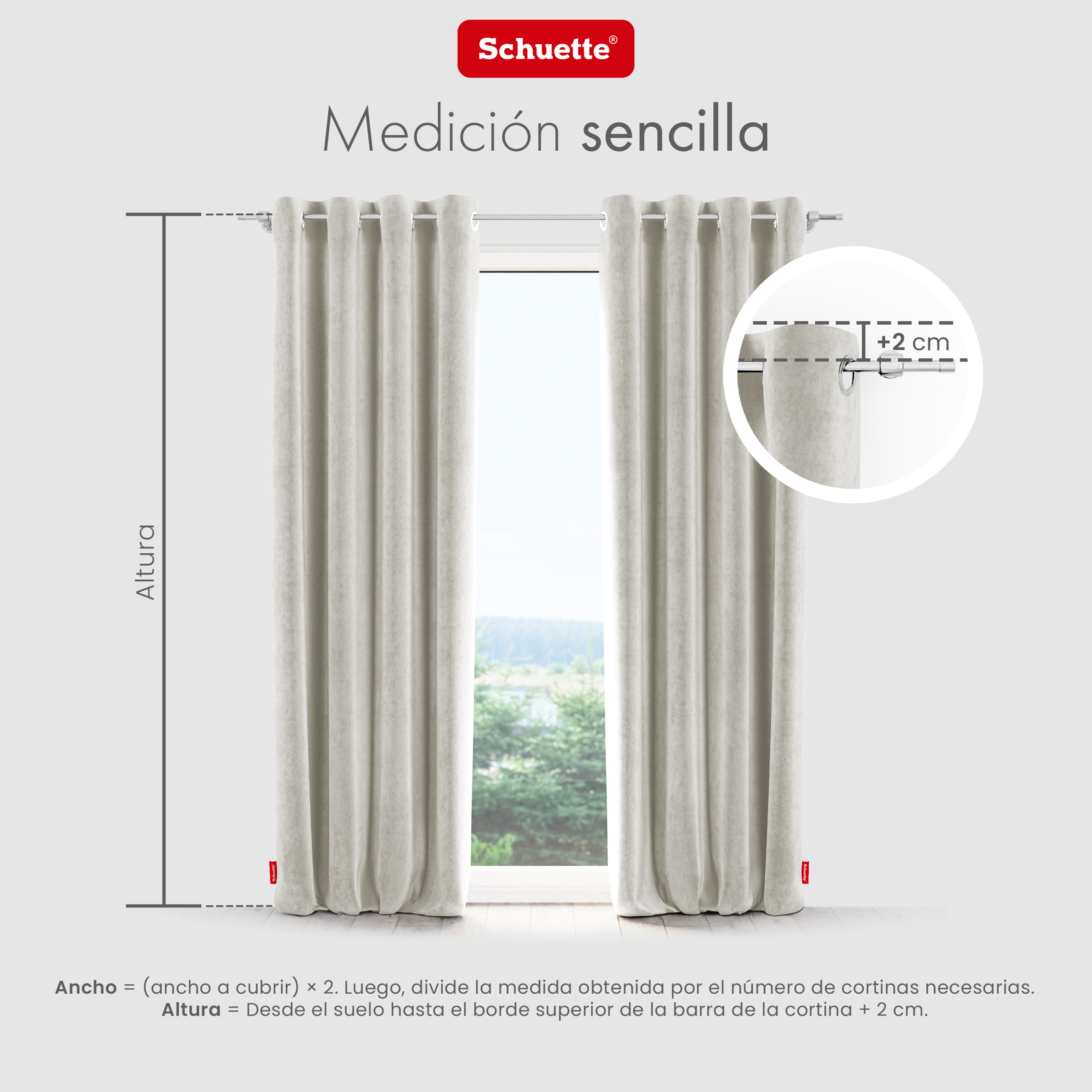 - Medir correctamente es muy fácil: Por favor, mida la altura desde el suelo hasta la barra de la cortina y añada al menos 4 cm, para que así la cortina toque ligeramente el suelo. Ancho = (ancho a cubrir) x 2. A continuación, divida la medida obtenida por el número de paños necesarios. Todas las dimensiones de las cortinas Schuette ofrecidas son ancho x alto.