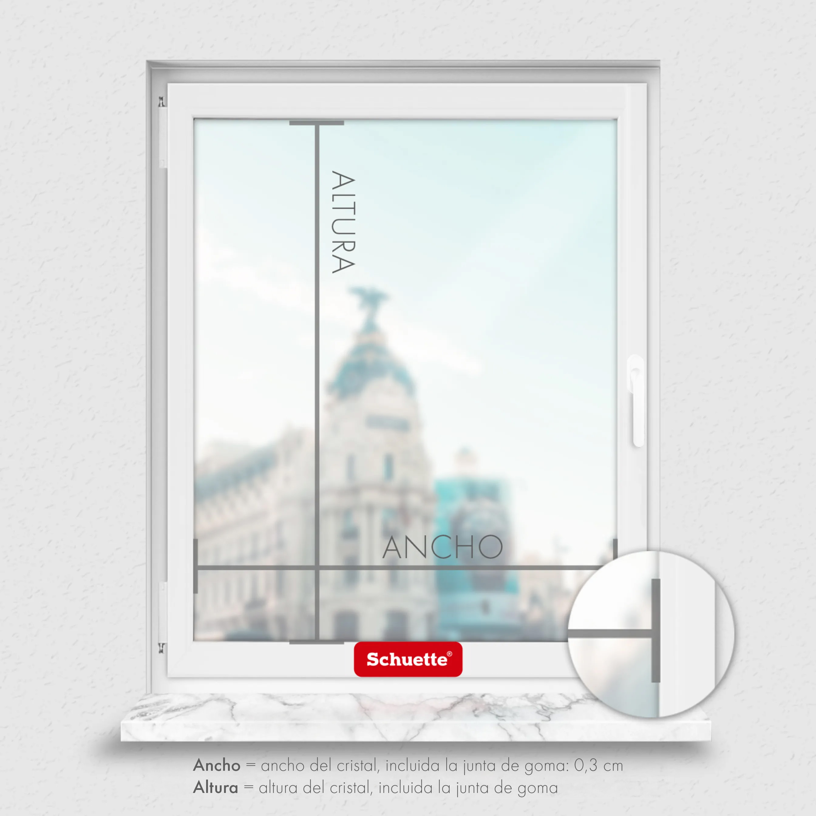 - Instrucciones de medición: Ancho = ancho del cristal de la ventana incluido el sellado de goma (cristal de izquierda a derecha) -0,3 cm x alto = altura del cristal de la ventana incluido el sellado de goma (cristal de abajo hacia arriba) + 1 cm. Para los junquillos inclinados, le recomendamos que mida la anchura en la mitad del mismo, de derecha a izquierda, y no le reste nada. La anchura pedida es la anchura real del estor plisado.