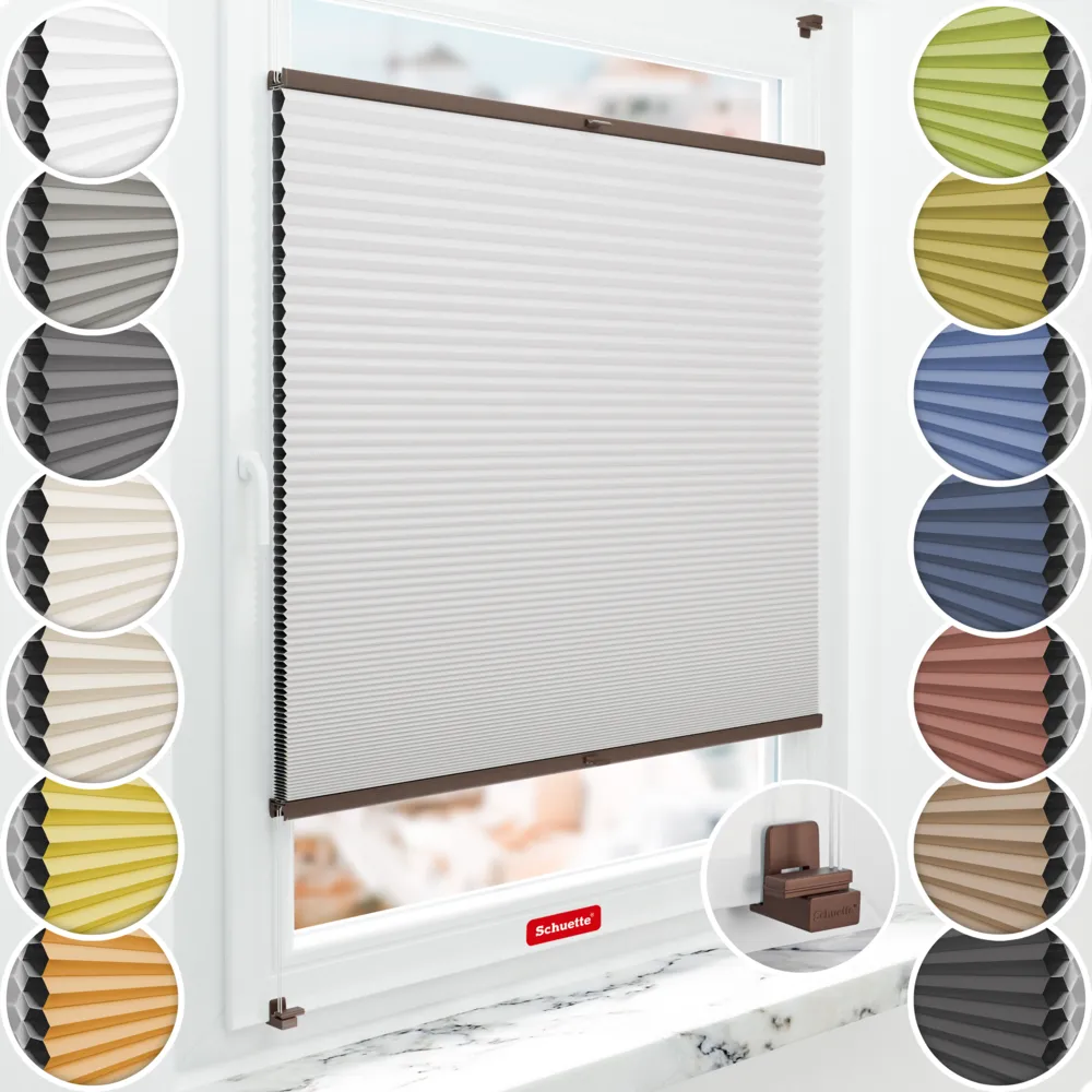 Schuette® Estor opaco termico celular a medida • Colección Blackout x Honey: Gray-zy in Love (Gris pastel) • Soporte clip de sujeción Suprafix “X“ • Color del prefil: Nogal