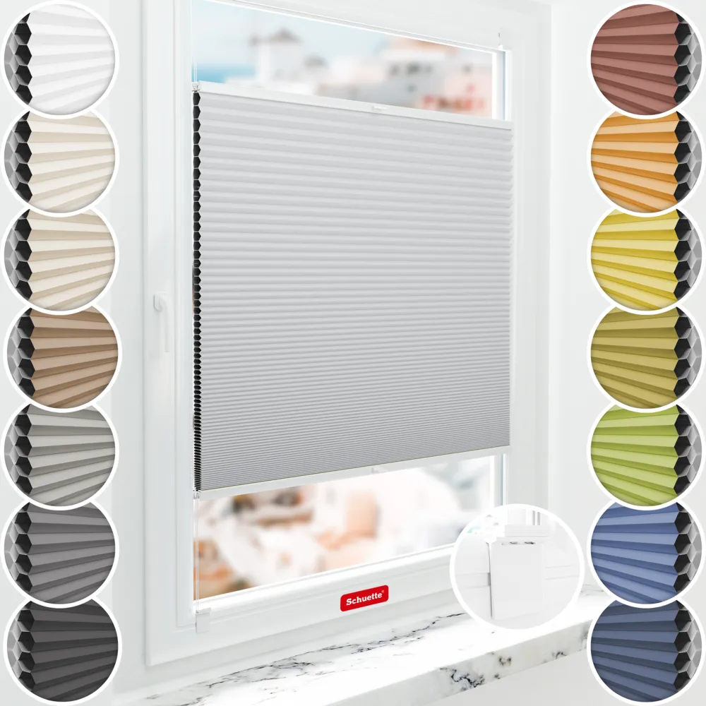 Schuette® Estor opaco termico celular a medida • Colección Blackout x Honey: Skyfall (Gris claro) • Soporte adhesivo o con taladro 2in1 Suprafix "Letsbond" • Color del prefil: Nogal