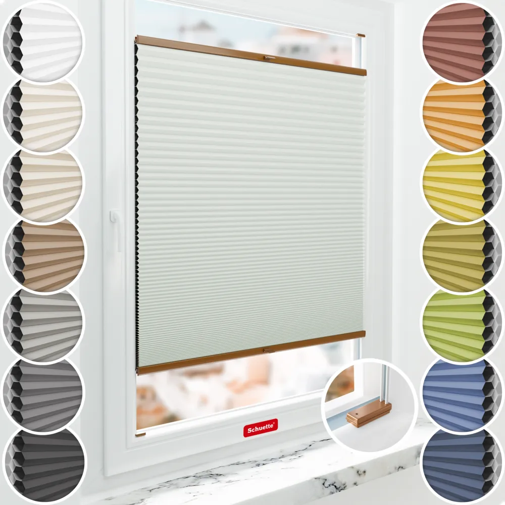 Schuette® Estor opaco termico celular a medida • Colección Blackout x Honey: Tinkerbell Twinkle (Verde pastel) • Soporte de fijación Suprafix "Para atornillar" • Color del prefil: Roble
