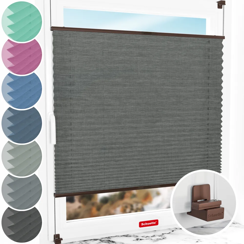 Schuette® Estor sin taladrar a medida • Colección Melangeo: Black Pearl (Negro) • Soporte clip de sujeción Suprafix “X“ • Color del perfil: Marrón