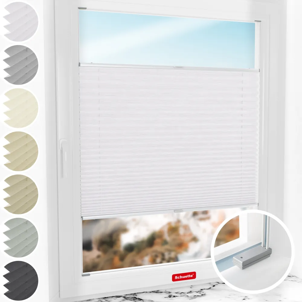 - Caractéristiques du store plissé Schuette® avec perçage : Réglable en continu (Up&Down), doublement tendu (PAS d'oscillation), profilés spéciaux en aluminium (PAS ! de flexion / rupture), montés dans la mesure du possible (PAS ! d'enfilage du cordon plissé / PAS d'assemblage de nombreuses pièces).