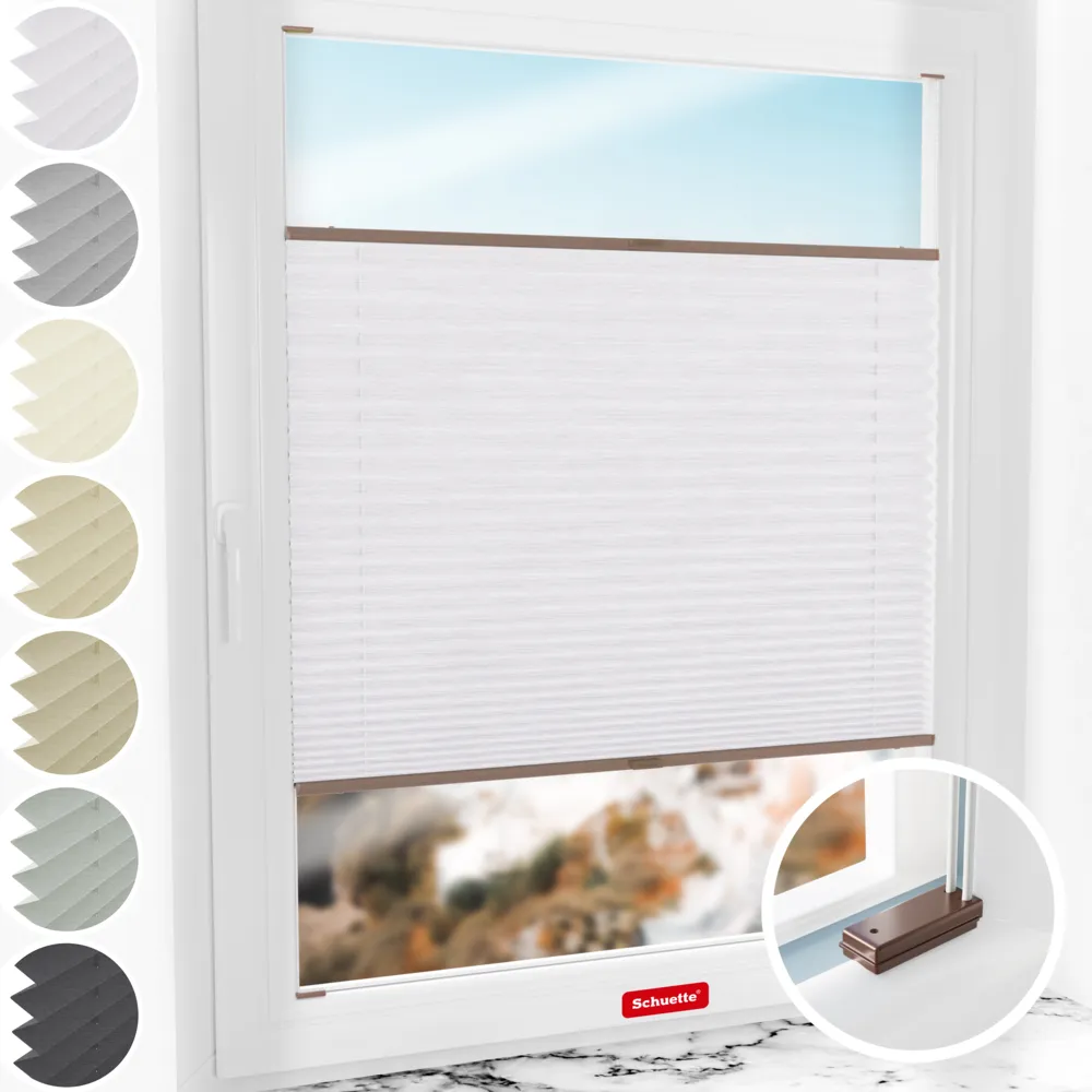 - Caractéristiques du store plissé Schuette® avec perçage : Réglable en continu (Up&Down), doublement tendu (PAS d'oscillation), profilés spéciaux en aluminium (PAS ! de flexion / rupture), montés dans la mesure du possible (PAS ! d'enfilage du cordon plissé / PAS d'assemblage de nombreuses pièces).