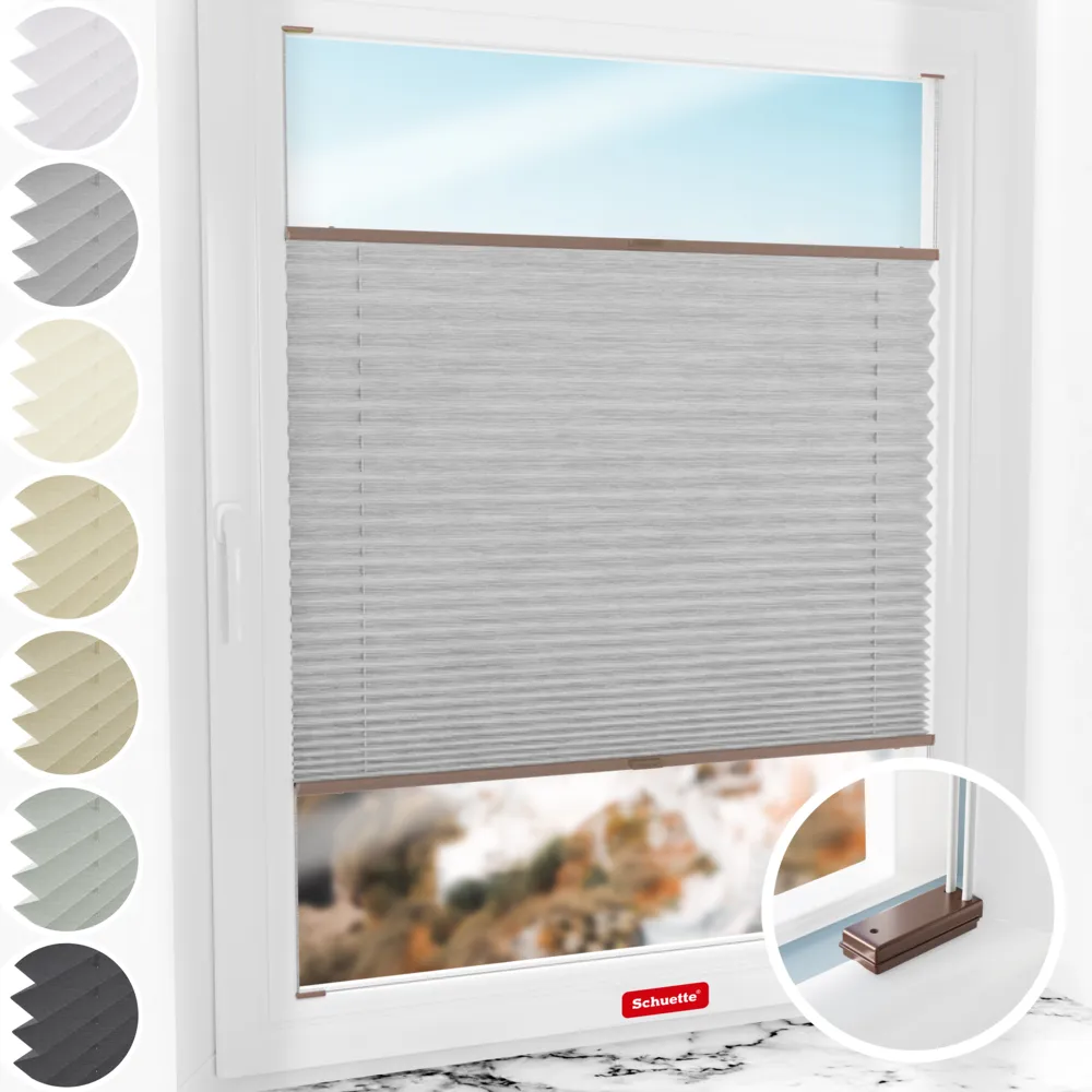 - Caractéristiques du store plissé Schuette® avec perçage : Réglable en continu (Up&Down), doublement tendu (PAS d'oscillation), profilés spéciaux en aluminium (PAS ! de flexion / rupture), montés dans la mesure du possible (PAS ! d'enfilage du cordon plissé / PAS d'assemblage de nombreuses pièces).