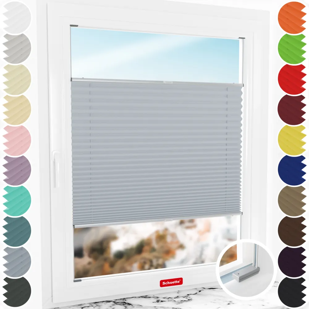 - Caractéristiques du store plissé Schuette® avec perçage : Réglable en continu (Up&Down), doublement tendu (PAS d'oscillation), profilés spéciaux en aluminium (PAS ! de flexion / rupture), montés dans la mesure du possible (PAS ! d'enfilage du cordon plissé / PAS d'assemblage de nombreuses pièces).