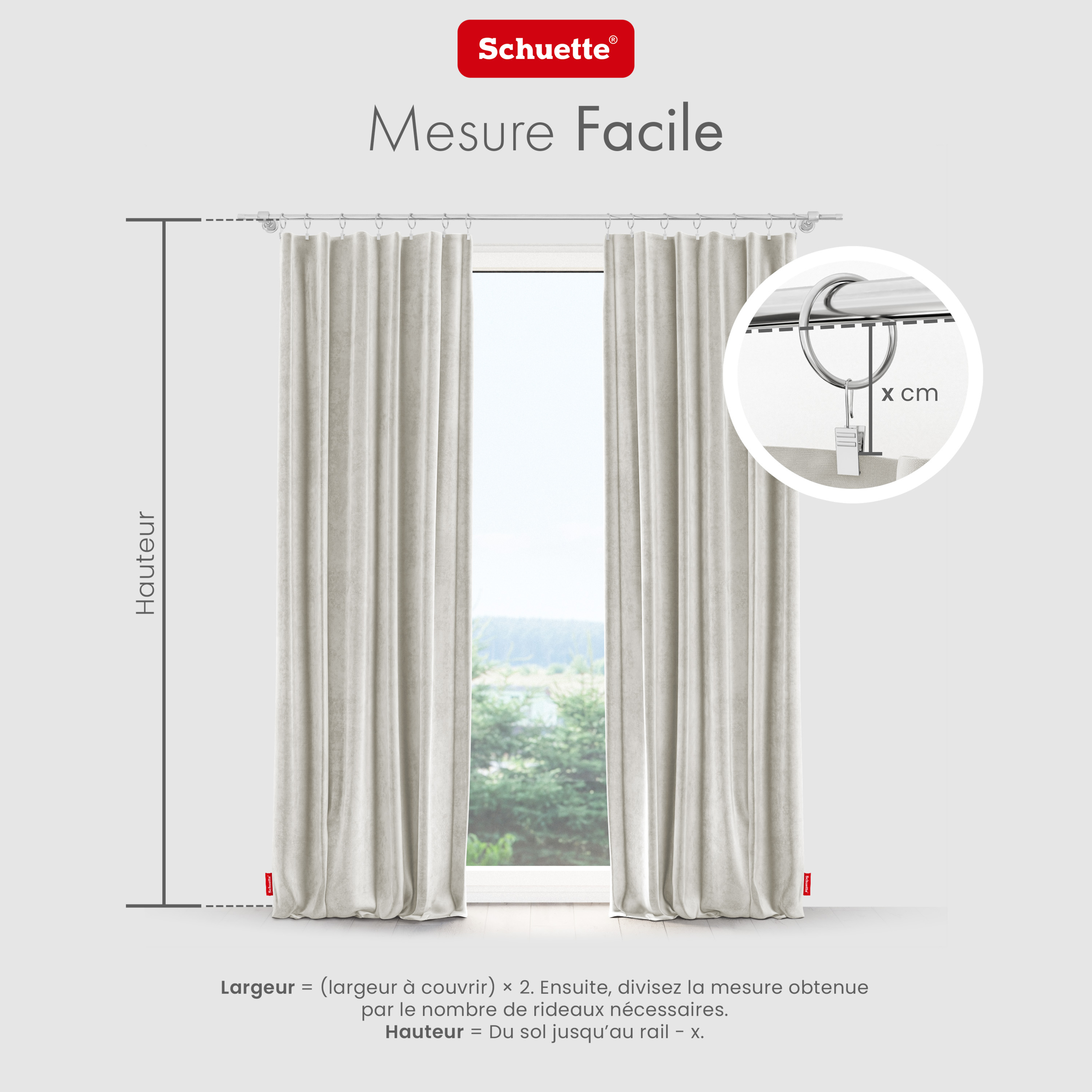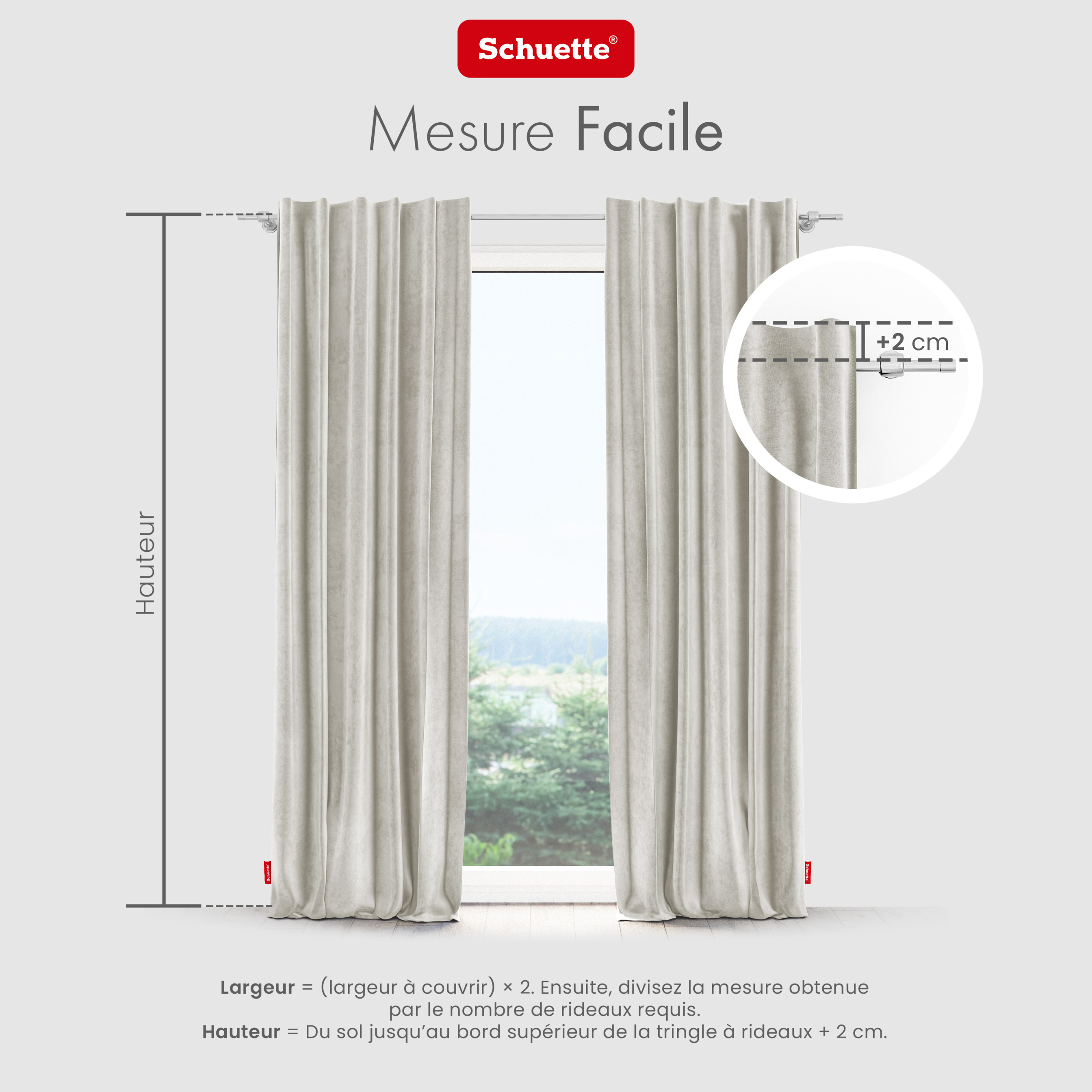 - Instructions de mesure : a) Montage sur tringle : Hauteur = du sol jusqu’au bord supérieur de la tringle, plus au moins 2 cm afin que le rideau effleure légèrement le sol ; b) Montage avec pinces : Hauteur = du sol jusqu’au point où la pince saisit le tissu en haut ; c) Montage avec crochets : Hauteur = du sol jusqu’au crochet du rideau + 2 / 4 / 6 cm (excédent de tissu souhaité au-dessus du crochet) × Largeur = (largeur à couvrir) × 2. Ensuite, divisez la mesure obtenue par le nombre de panneaux nécessaires. Toutes les dimensions des rideaux Schuette® sont indiquées en largeur × hauteur. Pour les largeurs supérieures à 135 cm, deux rideaux sont cousus ensemble.