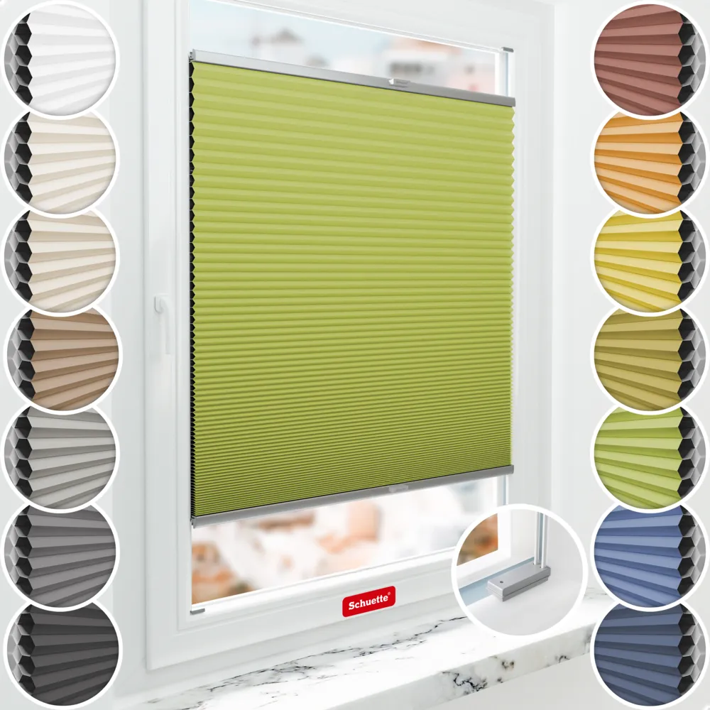 Schuette® store plissé occultant en nid d’abeille avec perçage sur mesure • Blackout x Honey Collection: Green Tea (Vert) • Supports Suprafix « Avec perçage » • Couleur du profil: Argent