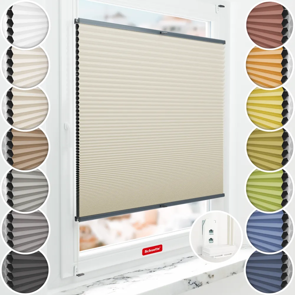 Schuette® store plissé occultant en nid d’abeille avec perçage sur mesure • Blackout x Honey Collection: Belgian Waffle (Crème) • Suprafix Support de fixation « Double 2en1 » • Couleur du profil: Anthracite
