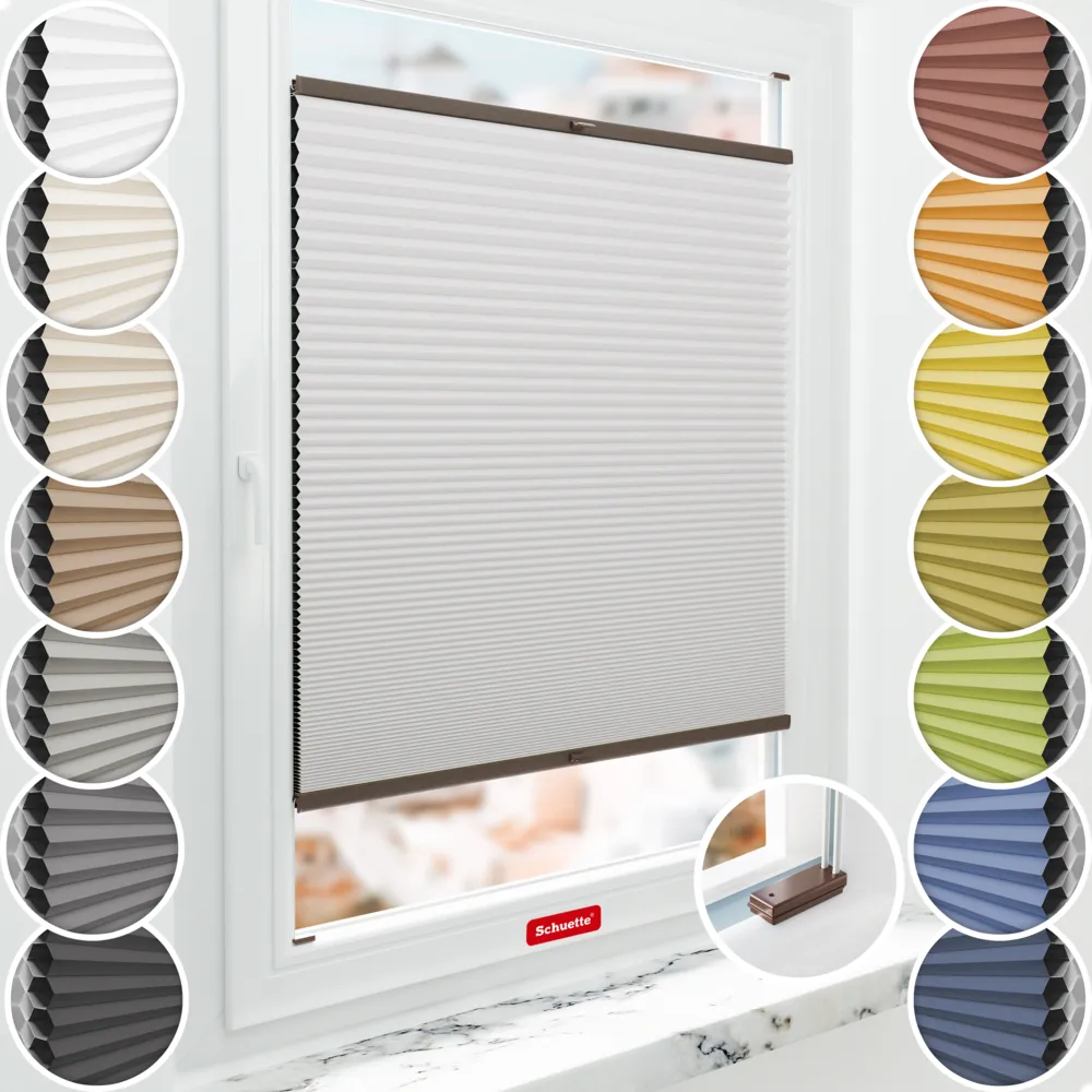 Schuette® store plissé occultant en nid d’abeille avec perçage sur mesure • Blackout x Honey Collection: Gray-zy in Love (Gris pastel) • Supports Suprafix « Avec perçage » • Couleur du profil: Noyer