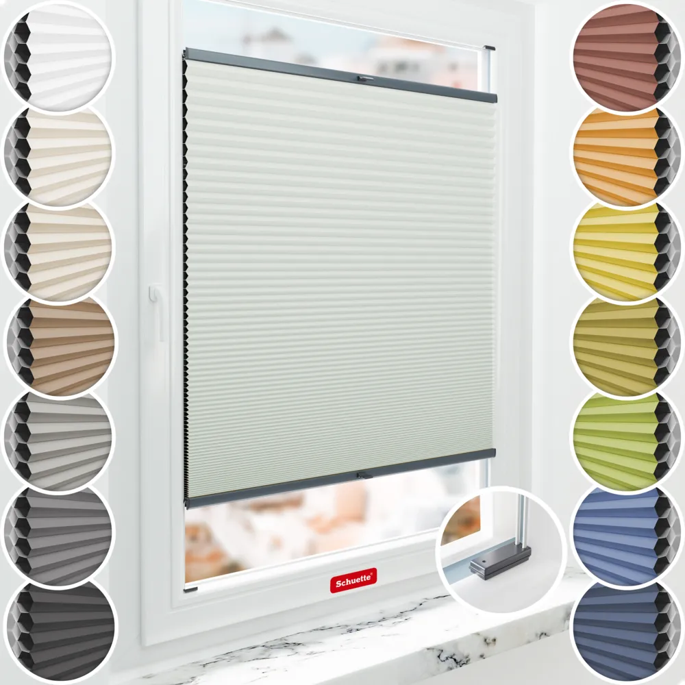 Schuette® store plissé occultant en nid d’abeille avec perçage sur mesure • Blackout x Honey Collection: Tinkerbell Twinkle (Vert pastel) • Supports Suprafix « Avec perçage » • Couleur du profil: Anthracite