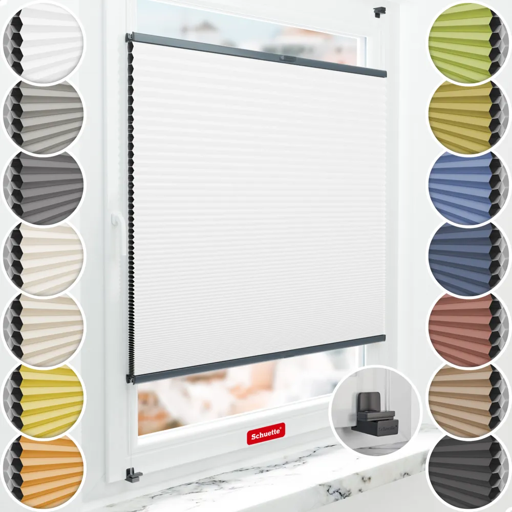 Schuette® Store plissé occultant en nid d’abeille sans perçage sur mesure • Suprafix Fixation sans perçage « X » • Blackout x Honey Collection: Moonlight (Blanc) • Couleur du profil: Anthracite