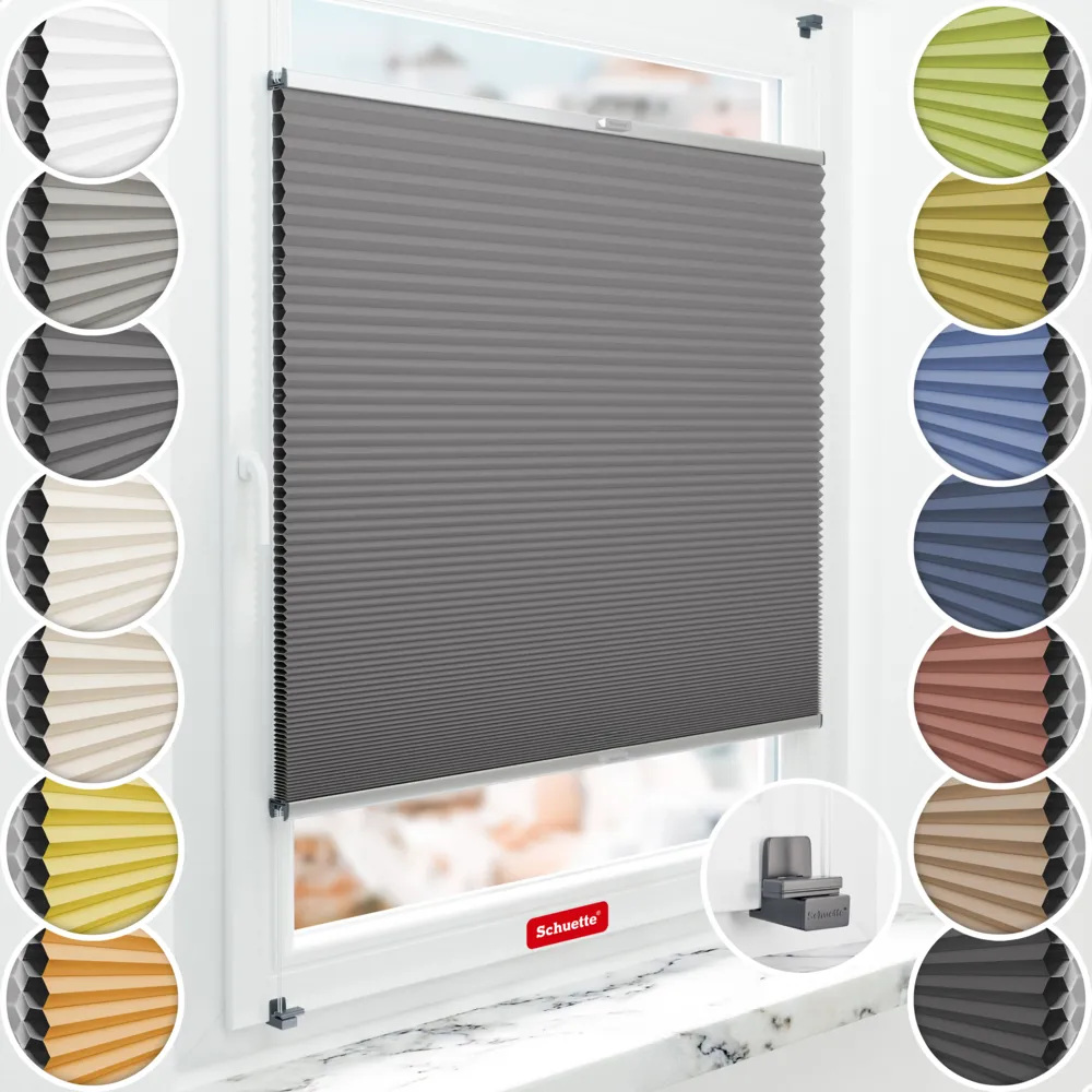 Schuette® Store plissé occultant en nid d’abeille sans perçage sur mesure • Suprafix Fixation sans perçage « X » • Blackout x Honey Collection: Twilight Tango (Gris) • Couleur du profil: Argent