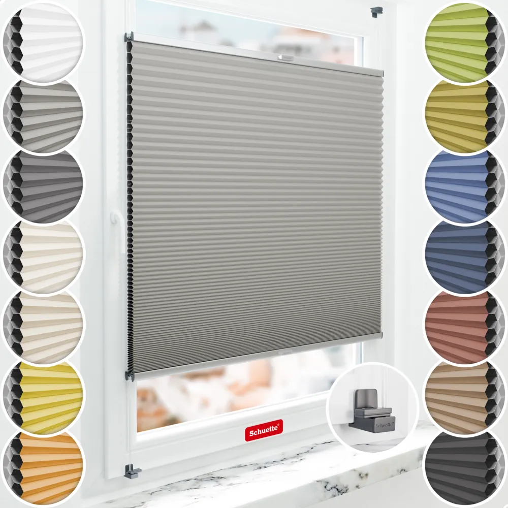 Schuette® Store plissé occultant en nid d’abeille sans perçage sur mesure • Suprafix Fixation sans perçage « X » • Blackout x Honey Collection: Silver Mist (Gris) • Couleur du profil: Argent