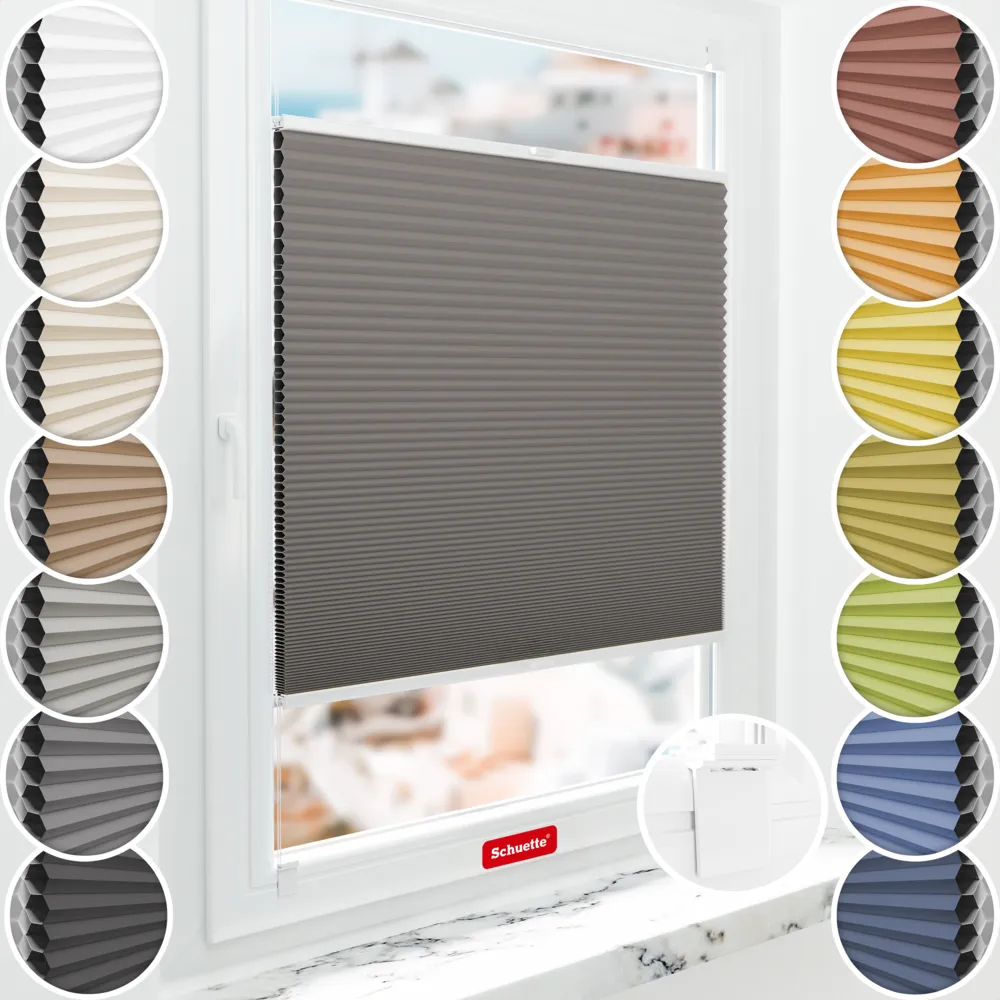 Schuette® store Plissé occultant en nid d’abeille sans perçage sur mesure •Suprafix kit de supports à coller et à visser 2en1 « Letsbond » transparent • Blackout x Honey Collection: Swiss Chocolate (Taupe) • Couleur du profil: Argent