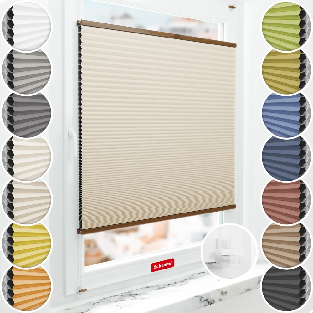 Schuette® store plissé occultant en nid d'abeille sans perçage sur mesure • Suprafix support de fixation « Incognito X » • Blackout x Honey Collection: The Dune (Beige) • Couleur du profil: Chêne