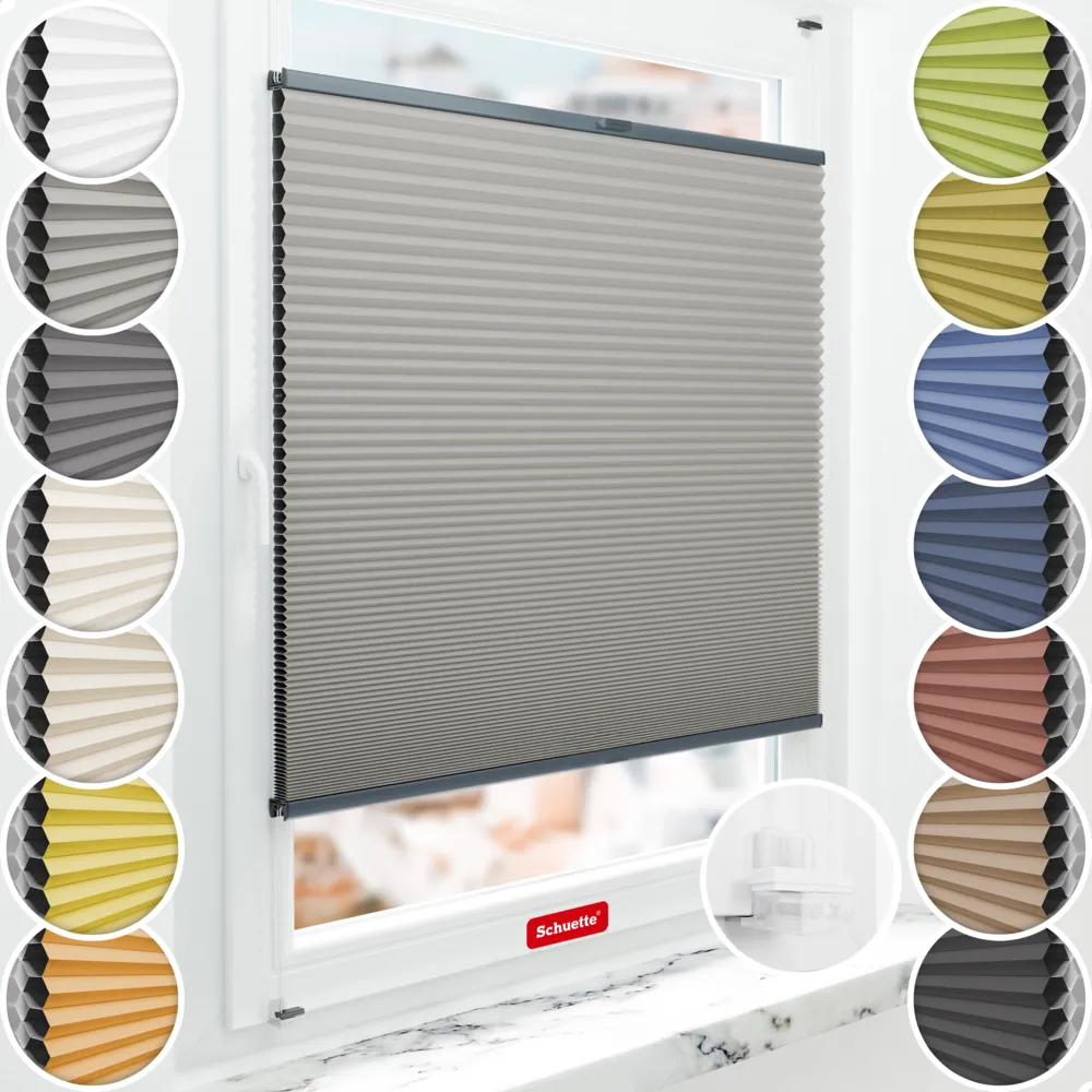 Schuette® store plissé occultant en nid d'abeille sans perçage sur mesure • Suprafix support de fixation « Incognito X » • Blackout x Honey Collection: Silver Mist (Gris) • Couleur du profil: Anthracite