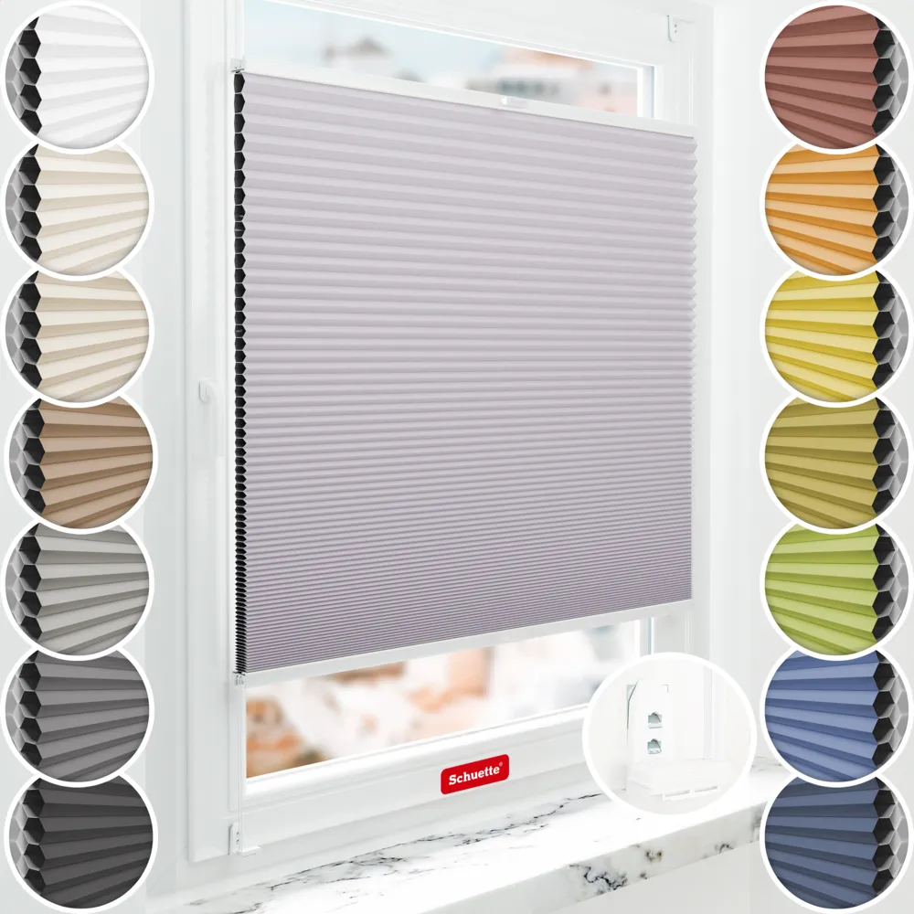 Schuette® store plissé occultant en nid d’abeille sans perçage sur mesure • Suprafix Support de fixation « Double 2en1 » • Blackout x Honey Collection: Sakura Sky (Violet pastel) • Couleur du profil: Blanc