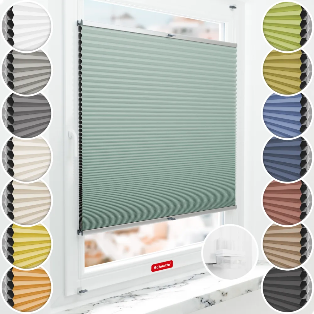 Schuette® store plissé occultant en nid d'abeille sans perçage sur mesure • Suprafix support de fixation « Incognito X » • Blackout x Honey Collection: Wicked Emerald (Vert pâle) • Couleur du profil: Argent