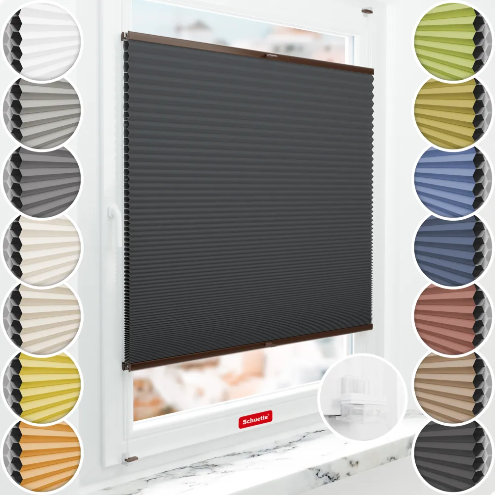 Schuette® store plissé occultant en nid d'abeille sans perçage sur mesure • Suprafix support de fixation « Incognito X » • Blackout x Honey Collection: Night Rider (Anthracite) • Couleur du profil: Marron