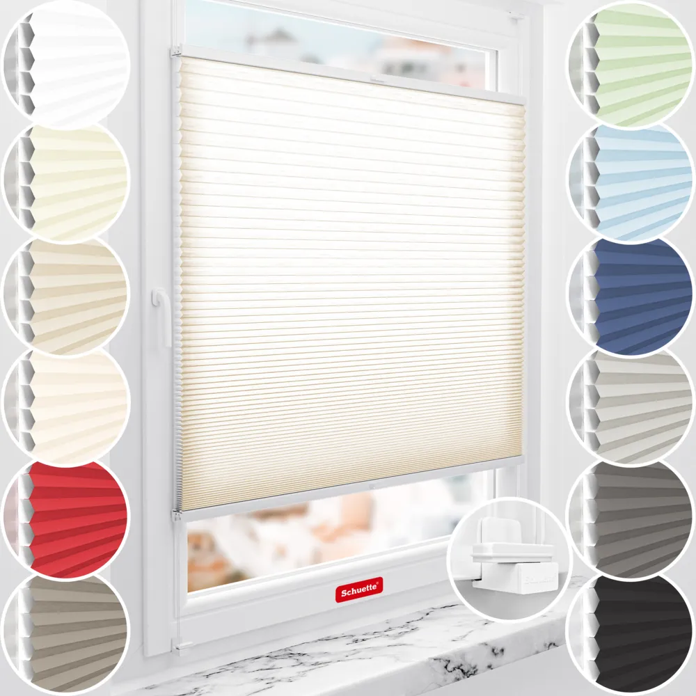 Schuette® store plissé thermique en nid d’abeille sans perçage sur mesure • Suprafix Fixation sans perçage « X » • Thermo x Honey Collection: Tahini cream (Crème) • Couleur du profil: Noyer