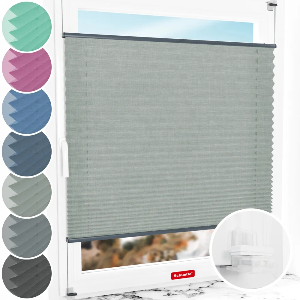 - Caractéristiques du store plissé Schuette® sans perçage : Réglable en continu (Up&Down), doublement tendu (PAS d'oscillation), profilés spéciaux en aluminium (PAS de flexion / rupture), montés dans la mesure du possible (PAS d'enfilage du cordon plissé / PAS d'assemblage de nombreuses pièces).