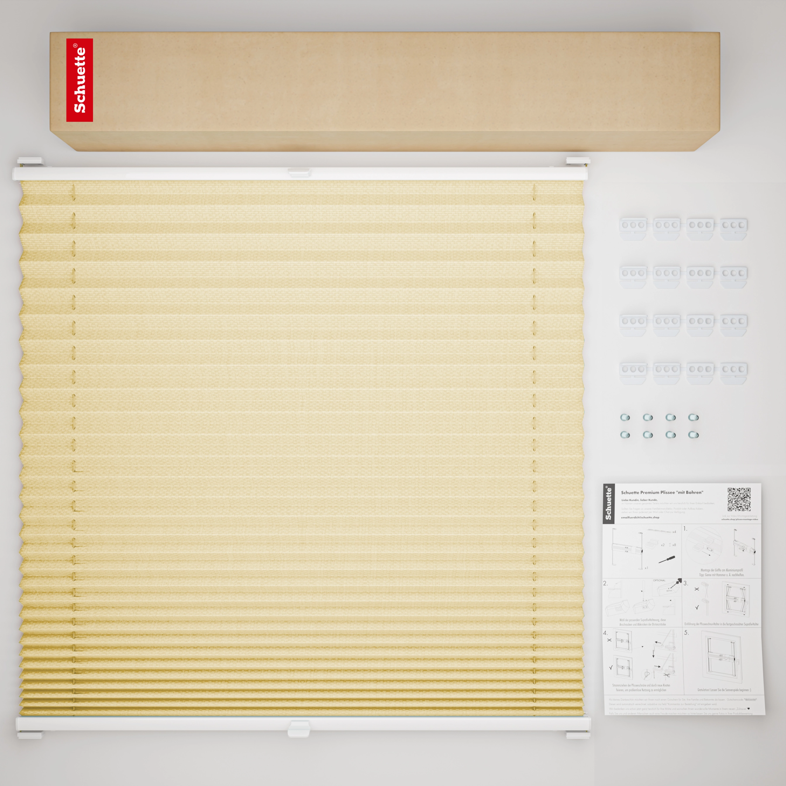 - Montage : Les supports de store plissé Schuette® Suprafix à visser / à percer garantissent une pose propre, esthétique, rapide et simple sans outils spéciaux. Nos instructions de montage sont bien sûr incluses, ainsi qu'un lien vers notre vidéo sur le montage des stores plissés ! Si vous avez des questions, notre support est à votre disposition.