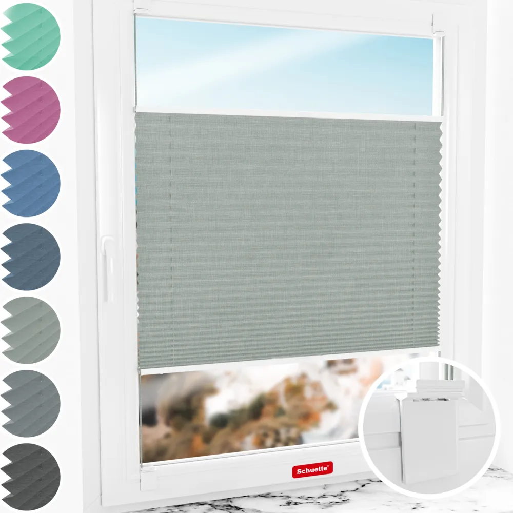 - Caractéristiques du store plissé Schuette® sans perçage : Réglable en continu (Up&Down), doublement tendu (PAS d'oscillation), profilés spéciaux en aluminium (PAS de flexion / rupture), montés dans la mesure du possible (PAS d'enfilage du cordon plissé / PAS d'assemblage de nombreuses pièces).