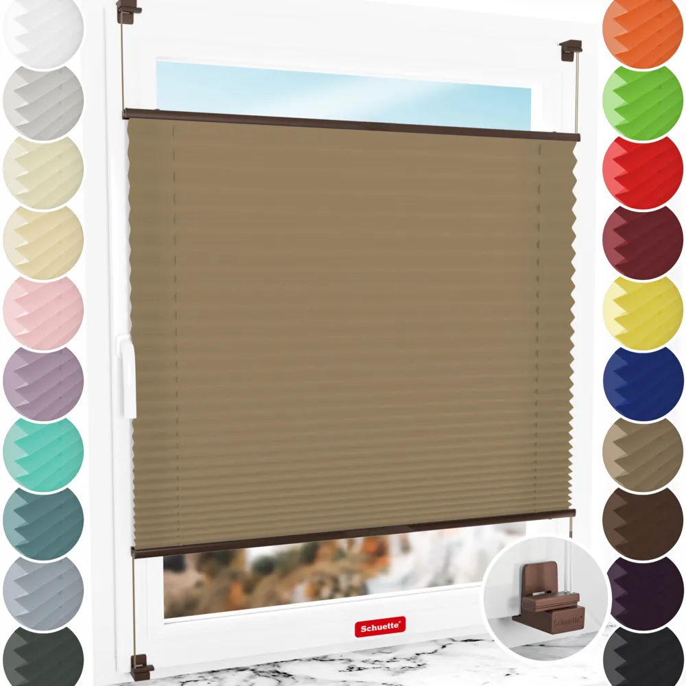 Schuette® Stores plissés sur mesure • Suprafix Fixation sans perçage « X » • Collection Premium • Morning Coffee (Marron clair) • Couleur du profil: Marron