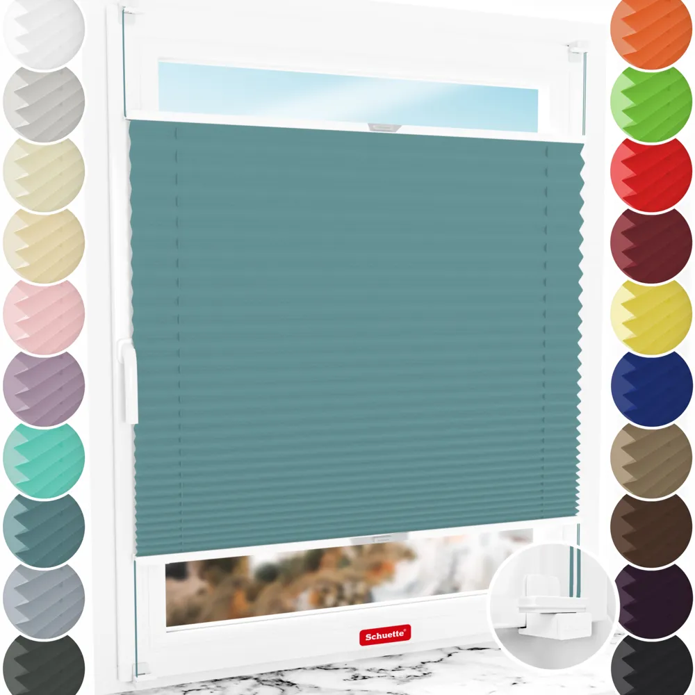 Schuette® Stores plissés sur mesure • Suprafix Fixation sans perçage « X » • Collection Thermo • Teal Aura (Bleu) • Couleur du profil: Argent