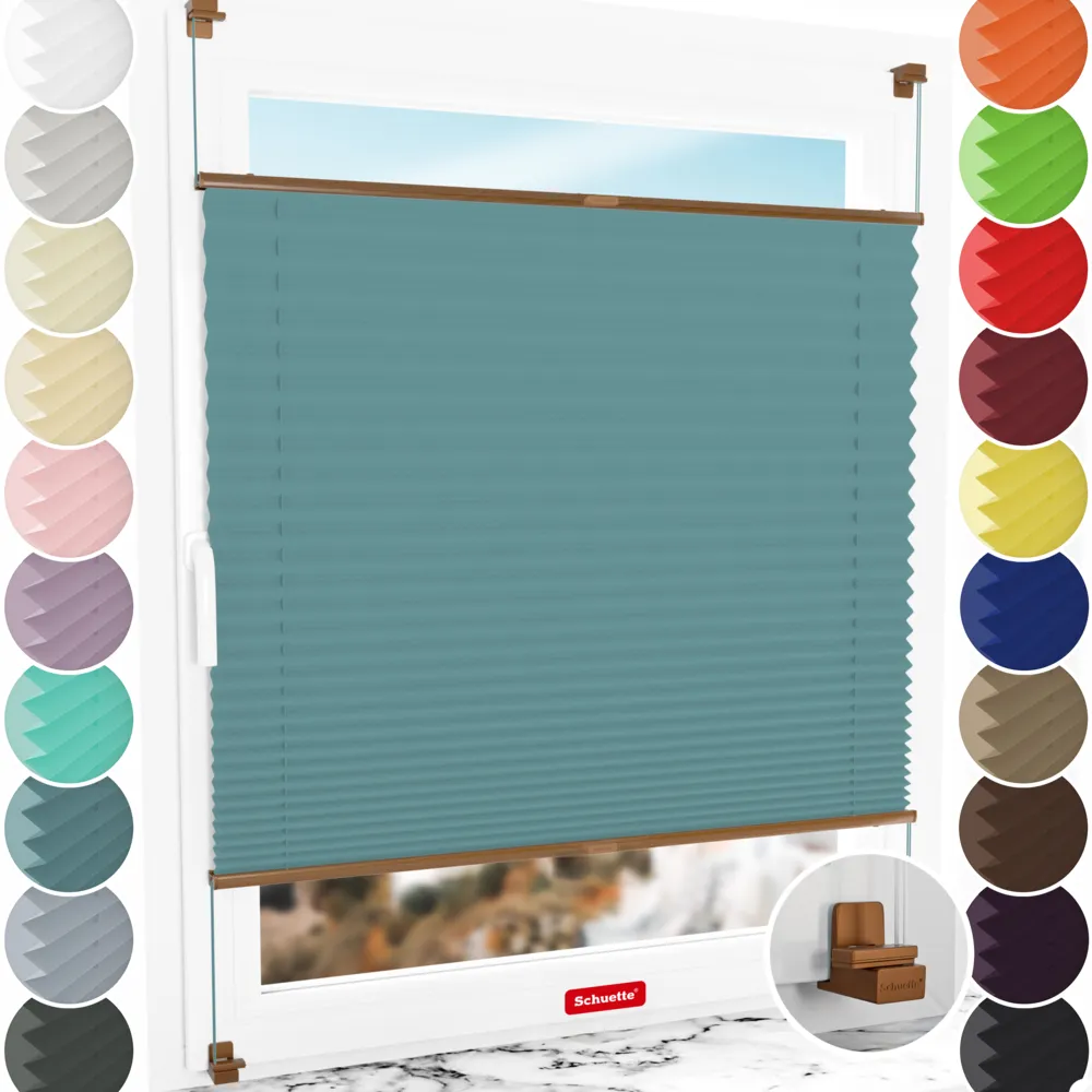 Schuette® Stores plissés sur mesure • Suprafix Fixation sans perçage « X » • Collection Thermo • Teal Aura (Bleu) • Couleur du profil: Chêne