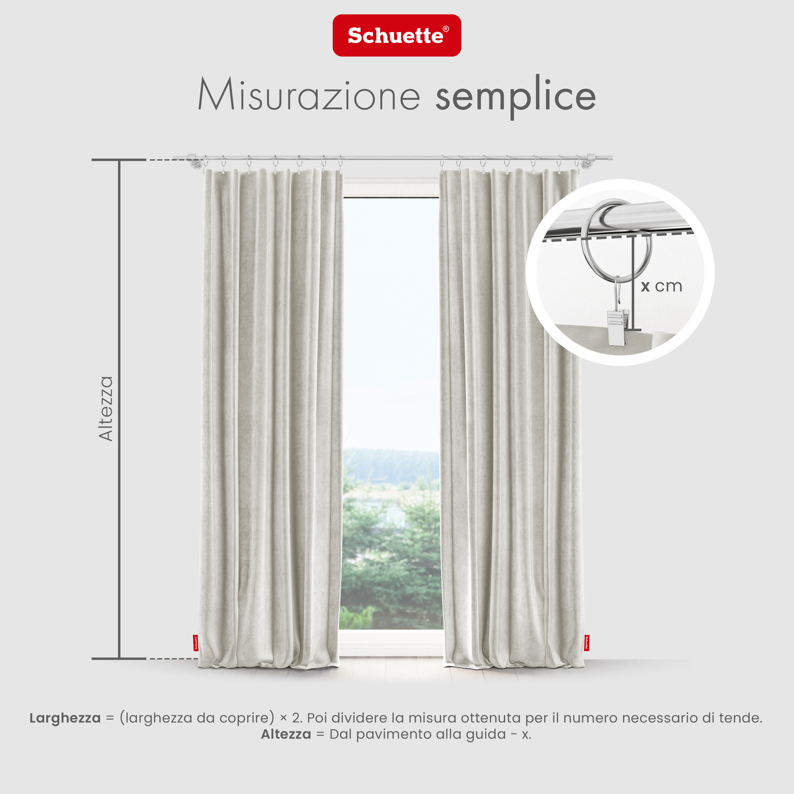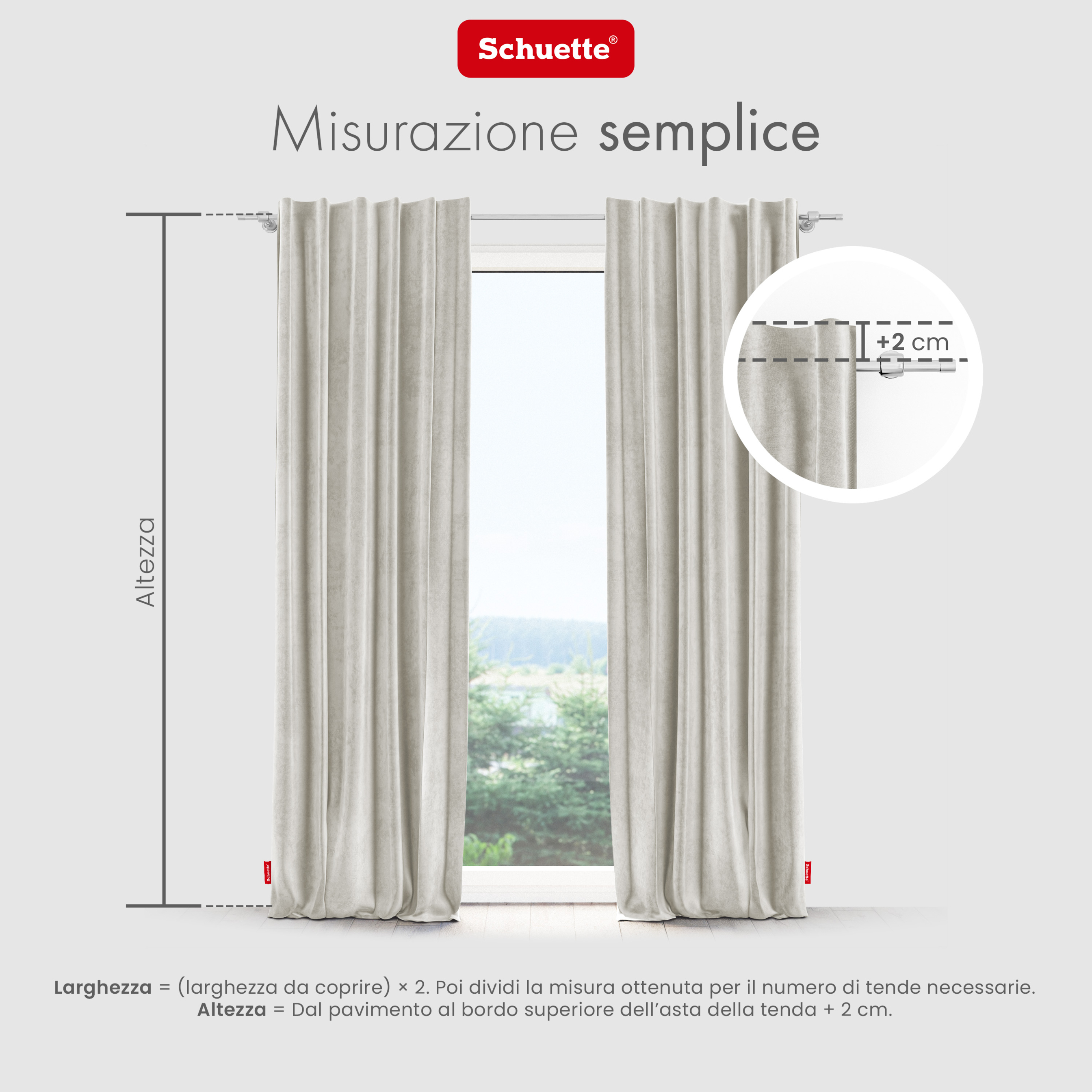 - Istruzioni per la misurazione: a) Montaggio su barra: Altezza = dal pavimento al bordo superiore della barra della tenda, aggiungendo almeno 2 cm affinché la tenda sfiori leggermente il pavimento; b) Montaggio con pinze: Altezza = dal pavimento al punto in cui la pinza afferra il tessuto nella parte superiore; c) Montaggio con ganci: Altezza = dal pavimento al gancio della tenda + 2 / 4 / 6 cm (il margine di tessuto desiderato sopra il gancio) × Larghezza = (larghezza da coprire) × 2. Poi dividere la misura ottenuta per il numero necessario di pannelli. Tutte le misure delle tende Schuette® sono indicate come larghezza × altezza. Per larghezze superiori a 135 cm, due tende vengono cucite insieme.