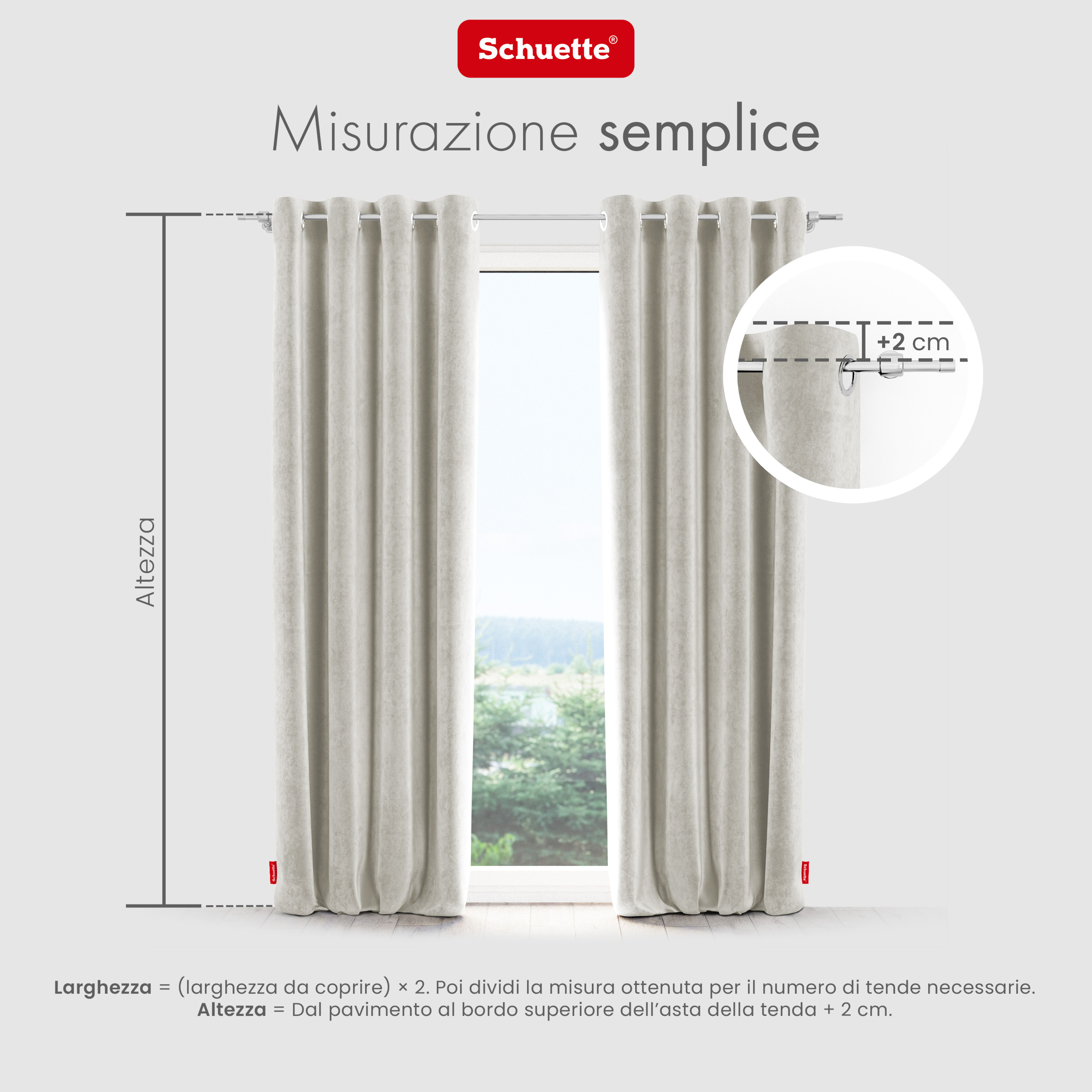 - Caratteristiche della tenda oscurante Schuette® con occhielli: sciarpa per tende assolutamente coprente in velluto di alta qualità con elevato effetto oscurante; elevata protezione dalla luce e miglioramento dell'acustica ambientale (isolamento acustico e riduzione del rumore); effetto termico di risparmio energetico (riduzione dello scambio di calore e freddo alla finestra); cucita a mano localmente con il massimo livello di artigianalità nella nostra manifattura familiare appositamente per voi.