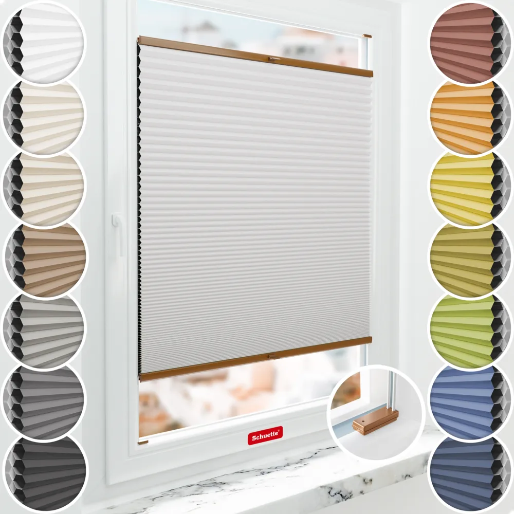 Schuette® Tenda plissé a nido d'ape con foratura su misura • Collezione Honeycomb: Gray-zy in Love (Grigio pastello) • Suprafix Supporti “Per l’avvitamento” • Colore del profilo: Rovere