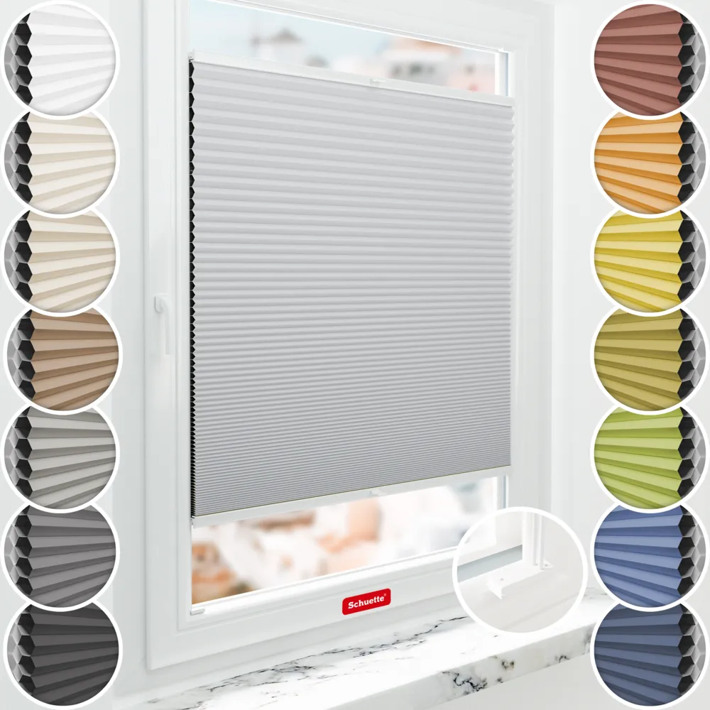 Schuette® Tenda plissé a nido d'ape con foratura su misura • Collezione Honeycomb: Skyfall (Grigio chiaro) • Suprafix Supporti “Per l’avvitamento” • Colore del profilo: Bianco