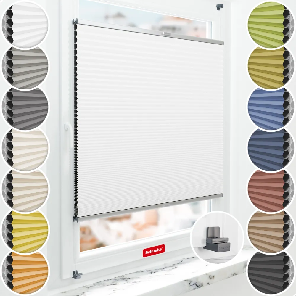 Schuette® Tenda plissettata a nido d'ape oscurante senza foratura su misura • Collezione Blackout x Honey: Moonlight (Bianco) • Suprafix Supporti a morsetto “X” • Colore del profilo: Argento