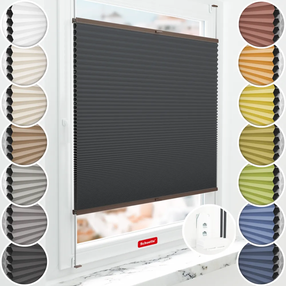 Schuette® Tenda plissettata a nido d'ape oscurante senza foratura su misura • Collezione Blackout x Honey: Night Rider (Antracite) • Suprafix Supporti “Double 2in1” • Colore del profilo: Noce
