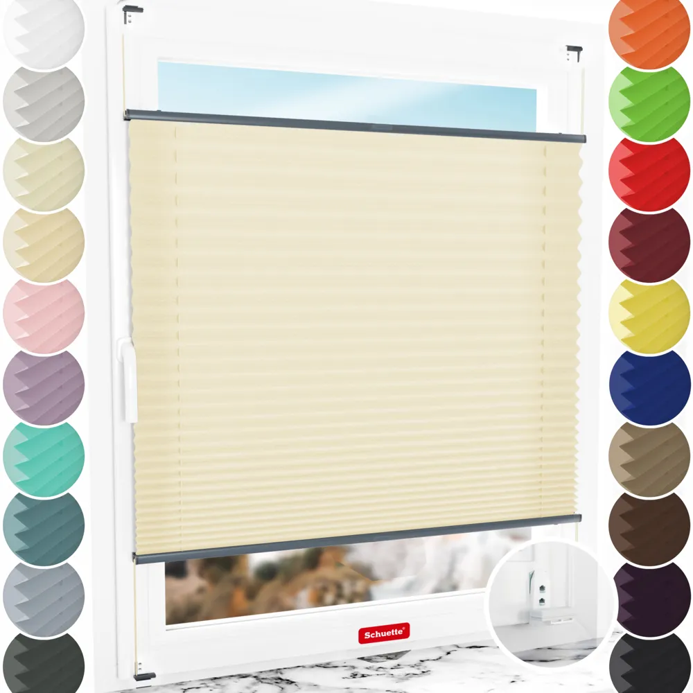 - Caratteristiche delle tende plissettate Schuette® con foratura: Regolazione continua (Up&Down), doppia tensione (NO oscillazione), profili speciali in alluminio (NO piegatura/rottura), completamente assemblate per quanto possibile (NO! infilare il cordone della tenda plissettata / NO! montaggio lungo di molte parti singole)